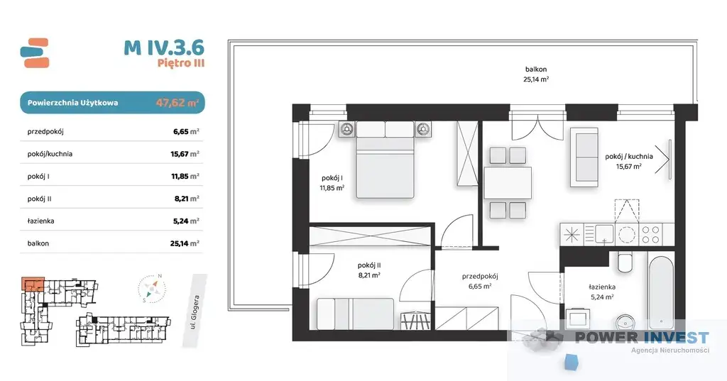 Mieszkanie znajduje się na 3 piętrze. Lokal ma powierzchnię 47,62 m² i składa się z: