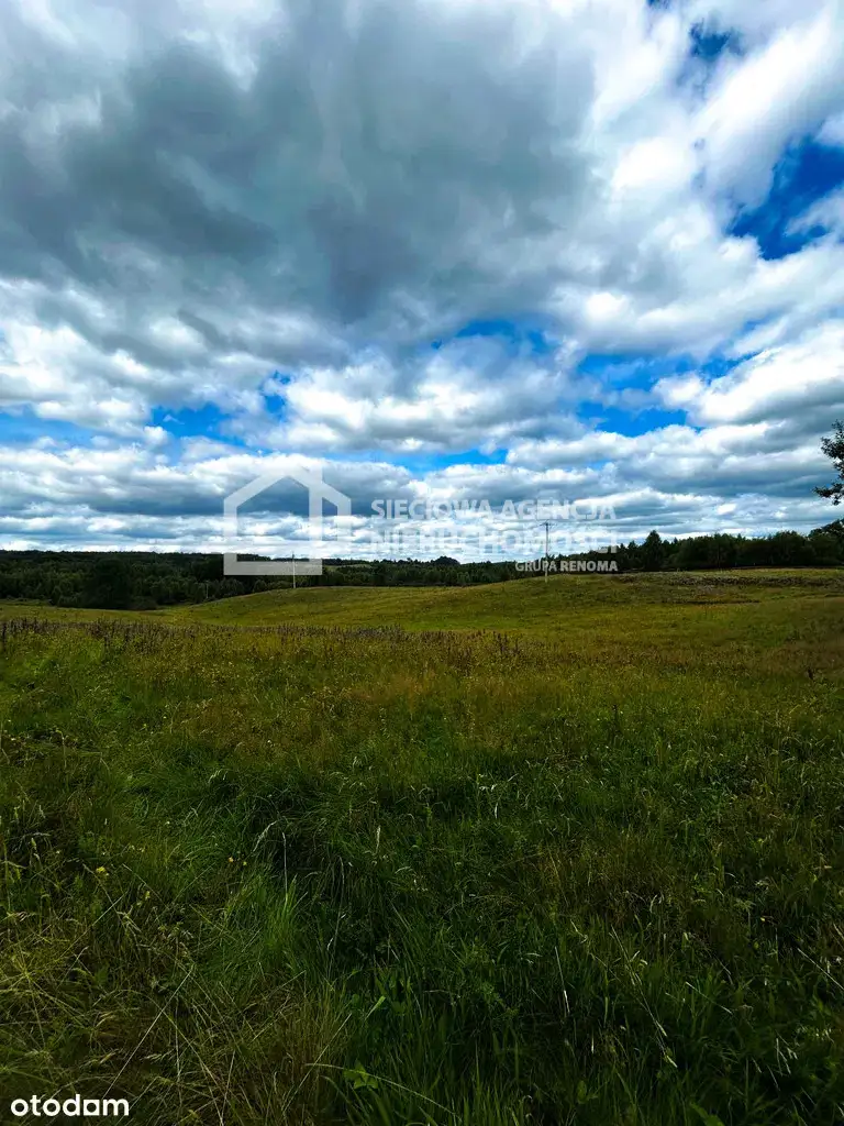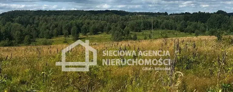 Nieruchomość o zróżnicowanym terenie z jednej strony pochylona w dalszej części płaska, pojedyncze drzewa.