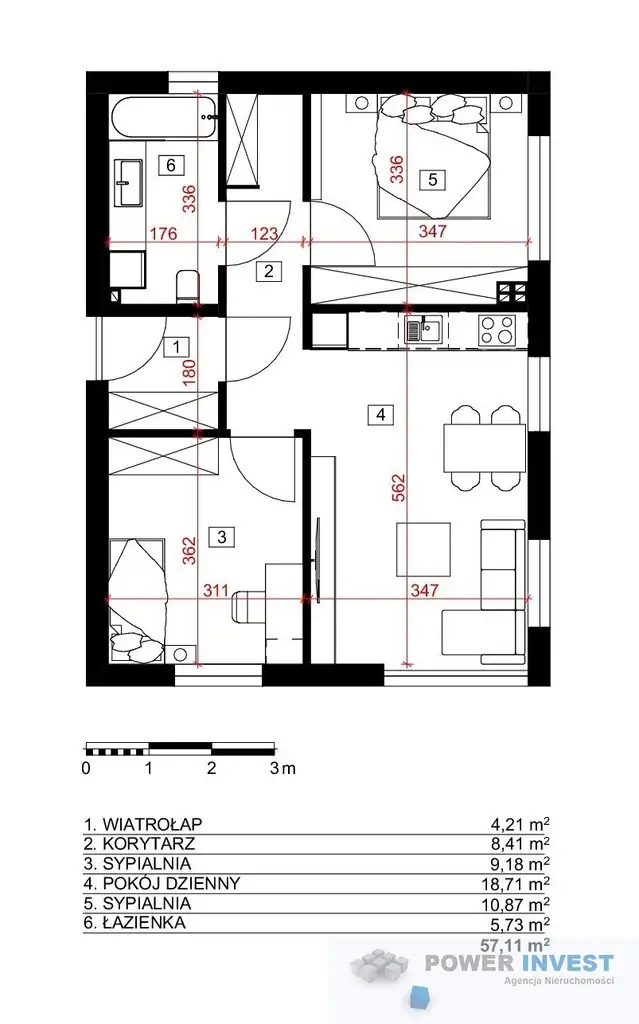 Nieruchomość znajduje się na parterze. Lokal ma powierzchnię 57,11 m² i składa się z: