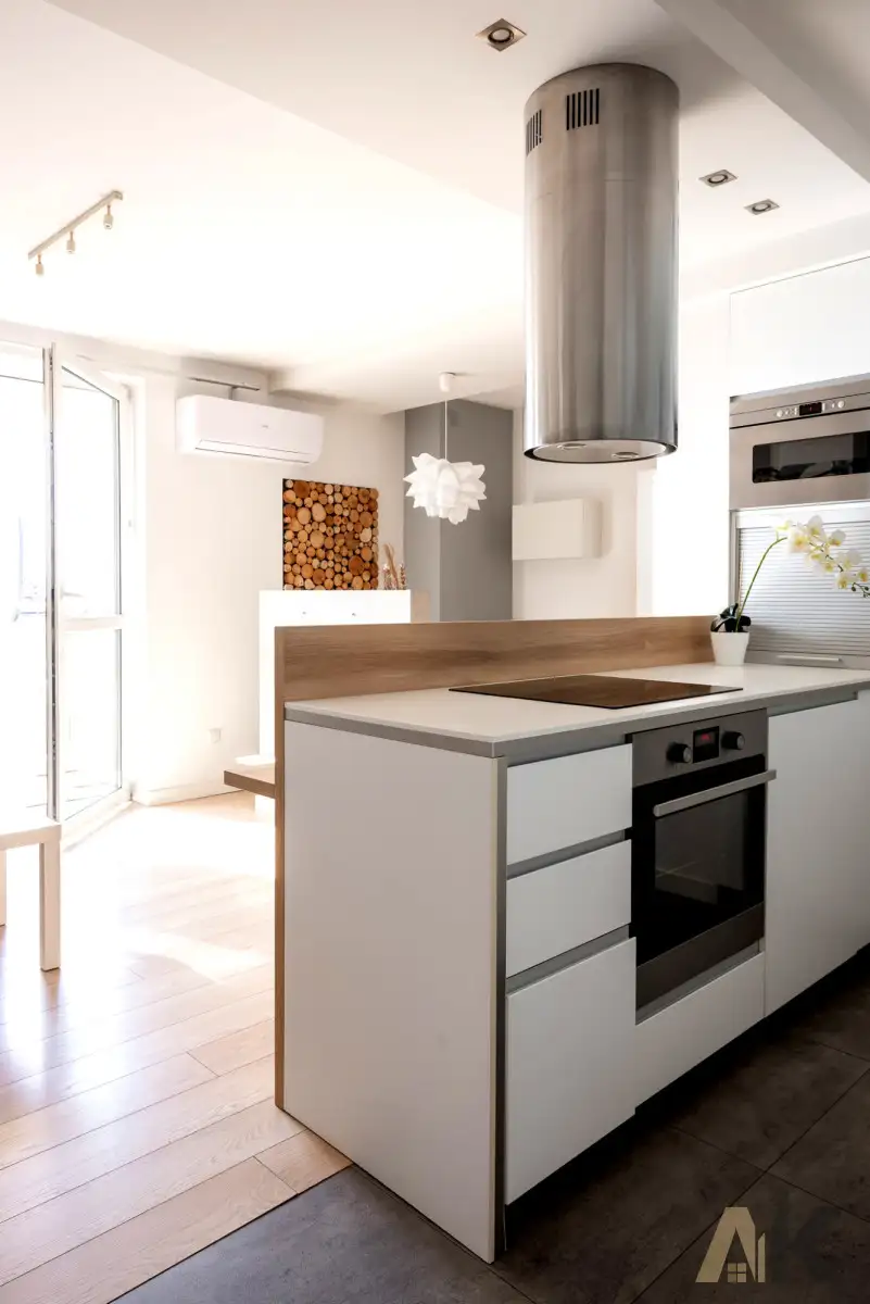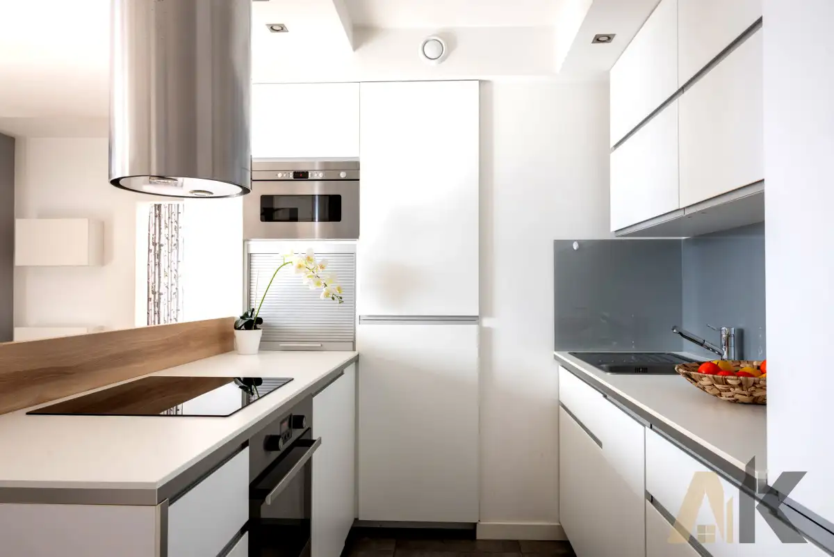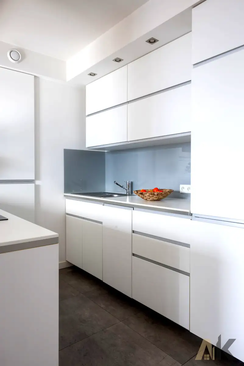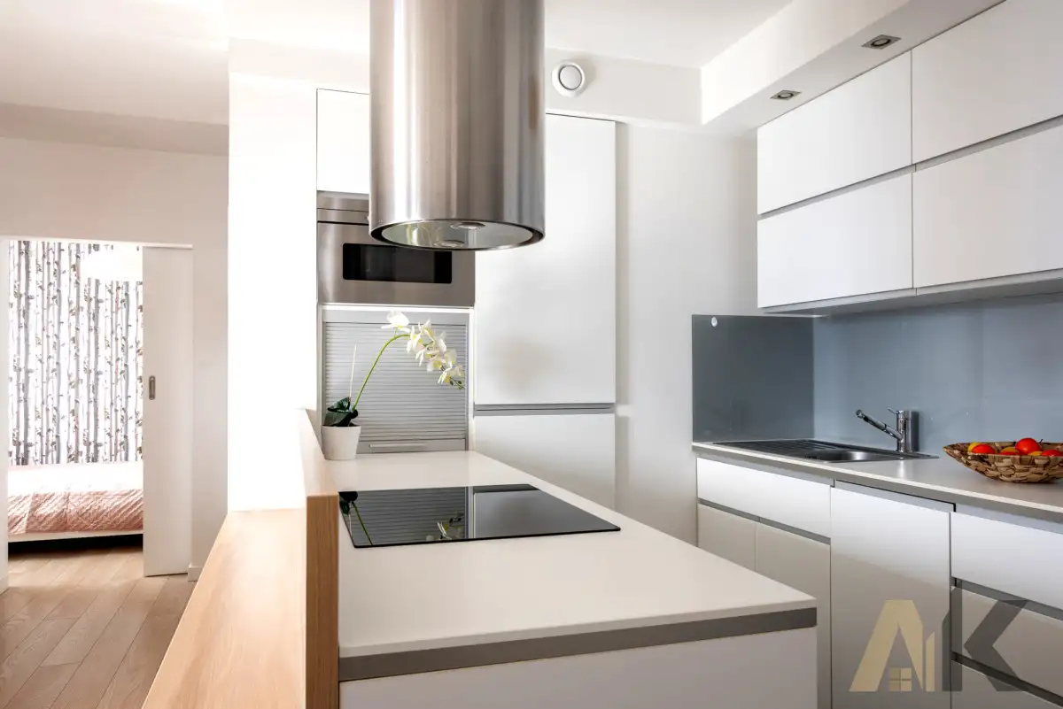 W zabudowie kuchennej: zlewozmywak, zmywarka, lodówka, piekarnik płyta indukcyjna, okap w zabudowie meblowej.