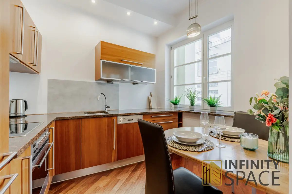 - partially open kitchen - equipped with all necessary kitchen appliances, with a large worktop and a table,