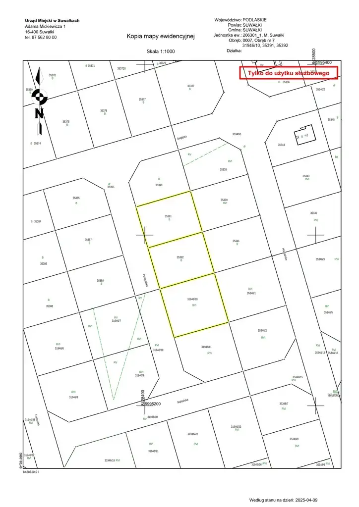 1. Oznaczona działką nr 35391 o powierzchni 0,0831 ha, niezabudowana, położona w Suwałkach w Obrębie nr 7, wchodząca w skład nieruchomości oznaczonej księgą wieczystą nr SU1S/00031671/3. Działka zgodnie z miejscowym planem zagospodarowania przestrzennego południowo - zachodniego rejonu ulicy Zastawie w Suwałkach zatwierdzonym Uchwałą LXVI/871/2024 Rady Miejskiej w Suwałkach z dnia 31.01.2024 roku, objęta jest konturem 10MNW - teren zabudowy mieszkaniowej jednorodzinnej wolnostojącej. Nieruchomość przeznaczona jest do sprzedaży w drodze przetargu ustnego nieograniczonego.