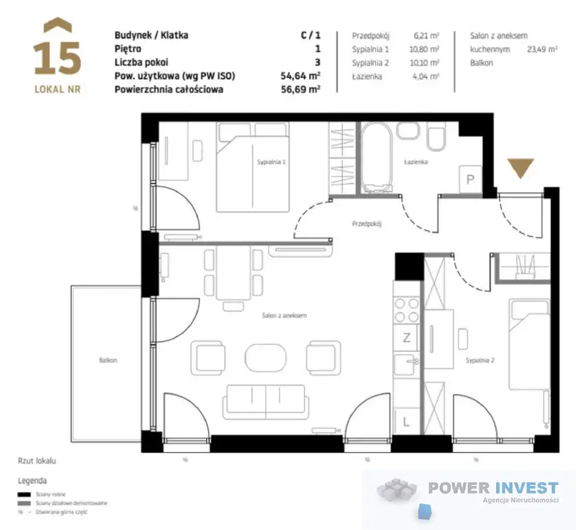 Przedpokój – 6,21 m² Sypialnia 1 – 10,80 m² Sypialnia 2 – 10,10 m² Łazienka – 4,04 m² Salon z aneksem kuch. – 23,49 m² Balkon