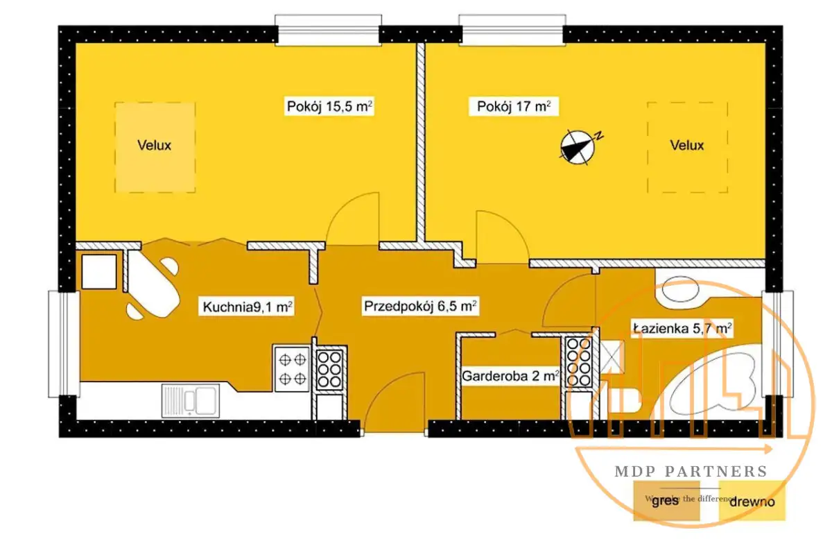 Najważniejsze atuty mieszkania:2 duże, jasne pokoje (15,5 m² i 17 m²), każdy z dwoma oknami (w tym dachowe Velux).