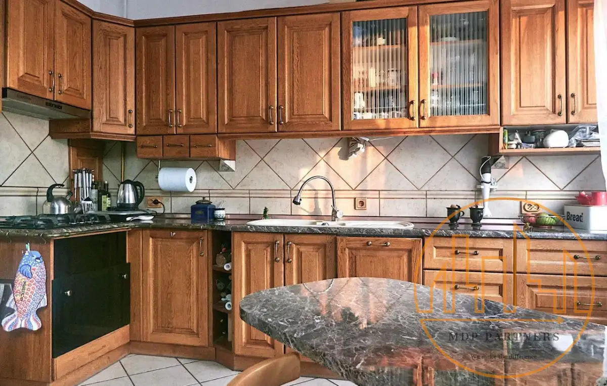 Widna kuchnia (9,1 m²) z zabudową z litego dębu, połączona z salonem podwójnymi drzwiami.