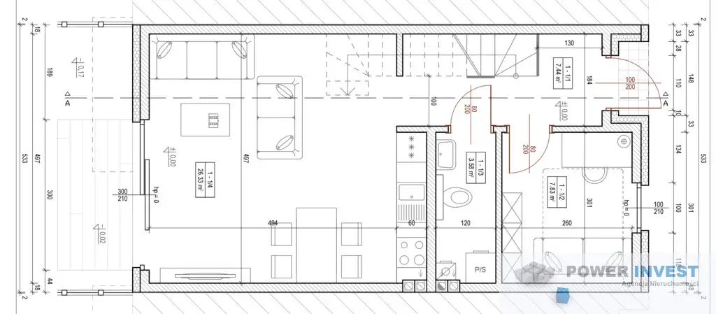 – salon z aneksem kuchennym – 26,33 m²