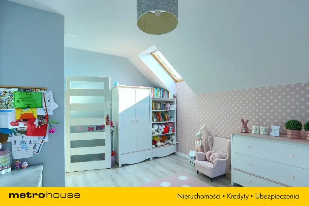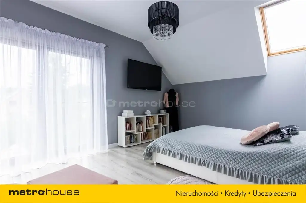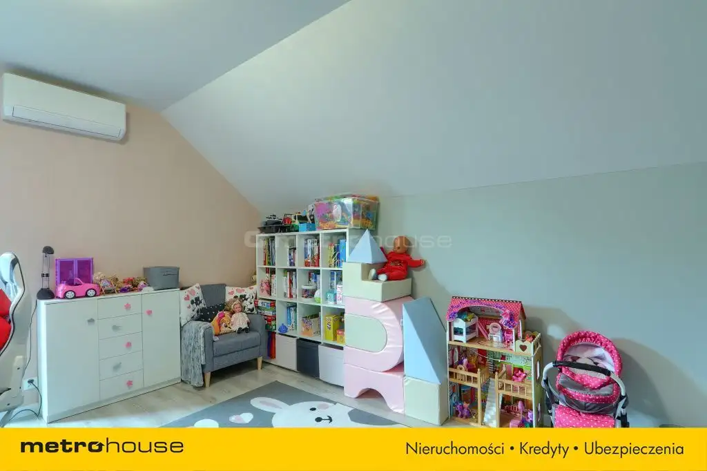schody prowadzą na pierwsze piętro gdzie znajduje się sypialnia z przestronną garderobą, otwarty pokój wyposażony w telewizor oraz kanapę, pokój dziecięcy oraz trzeci pokój pełniący funkcje sali zabaw. Wszystkie pokoje są umeblowane a całe wykończenie zrobione z materiałów z górnej półki. Dom został wyposażony w klimatyzacje gwarantującą komfort w upalne dni.