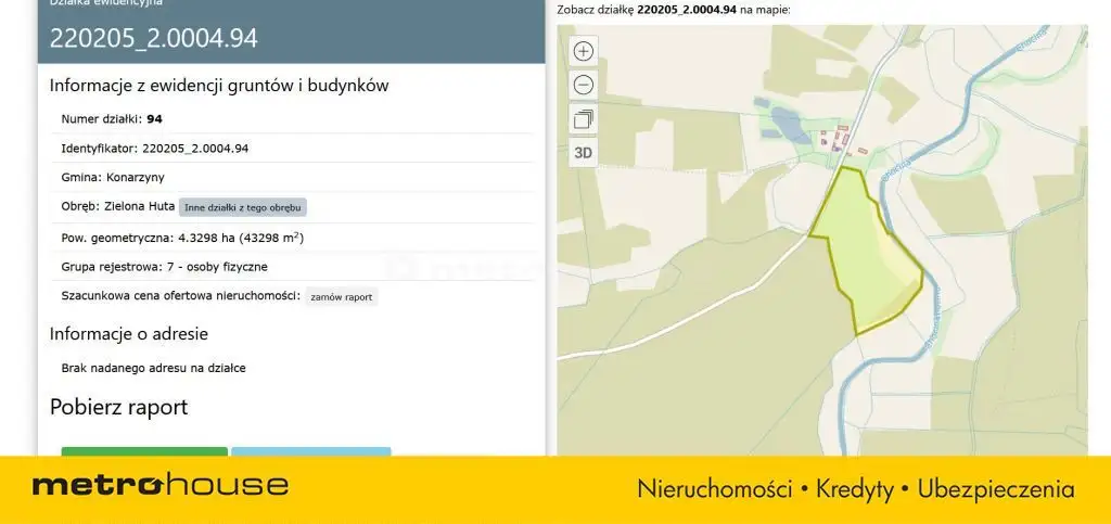 Działka siedliskowa z wydanymi warunkami zabudowy położona w Sercu Kaszub na malowniczym, urokliwym terenie.Powierzchnia to 4,0200ha /40 200m²/ o nieregularnym kształcie.ok. 0,3ha zalesiona; reszta w dużej części to zalesienie nieregularne - samosiejki /możliwość pozyskania materiału do wycinki/, na własnym terenie można zbierać grzybydojazd drogą gruntową utwardzoną w bardzo dobrym stanie; ok. 1,5km od drogi drogi wojewódzkiej DW212energia elektryczna: stacja transformatorowa z możliwością przyłącza - wzdłuż granicy działkiwoda - pozwolenia na własne ujęcie /obecnie najbardziej ekonomiczne rozwiązanie/kanalizacja - pozwolenia na przydomową oczyszczalnię /obecnie najbardziej ekonomiczne rozwiązanie/granica częściowo z linią brzegową rzeki Chociny - pierwsza klasa czystości, rzeka pstrągowa: odbywają się na niej spływy kajakowewokół ścieżki rowerowe i szlaki turystyczneNieruchomość usytuowana na niezwykle atrakcyjnym terenie, zarówno pod względem turystycznym, rekreacyjnym, inwestycyjnym.