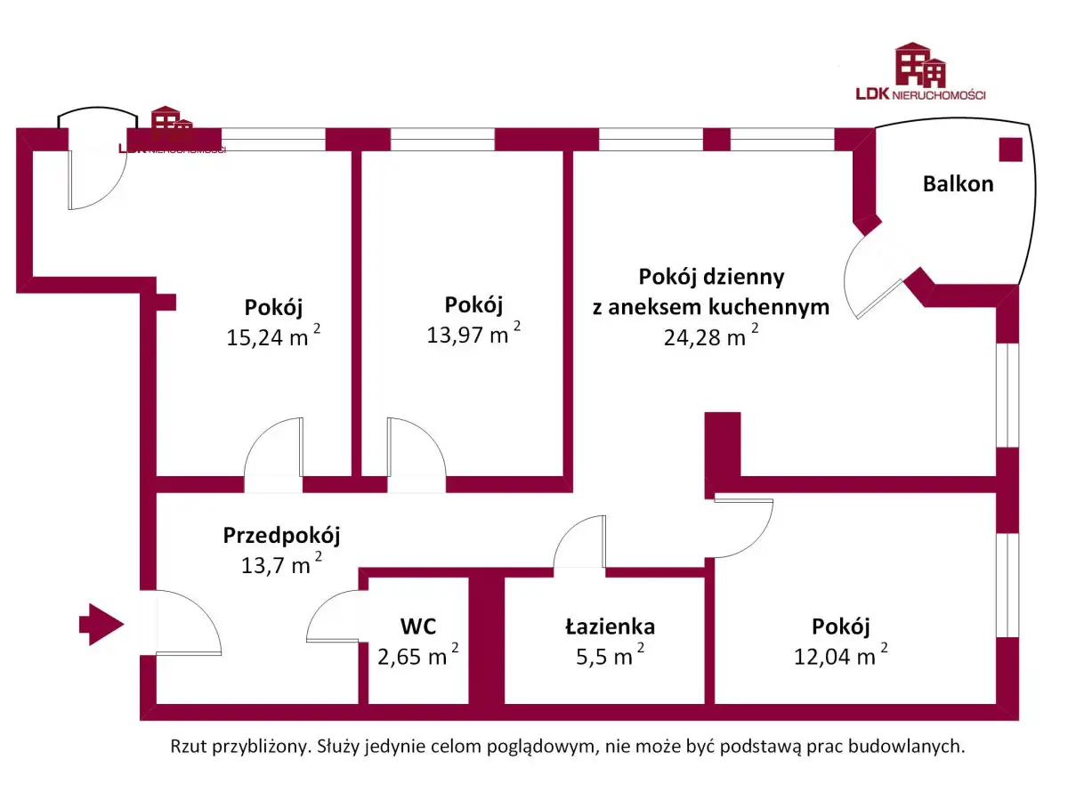 - jasny, przestronny salon z aneksem kuchennym i dużymi oknami, z wyjściem na klasyczny balkon,