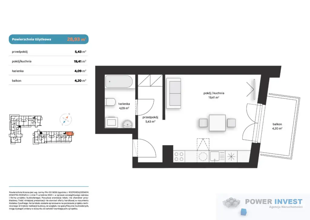 1-pokojowe mieszkanie z balkonem – 28,93 m² | 2 piętro