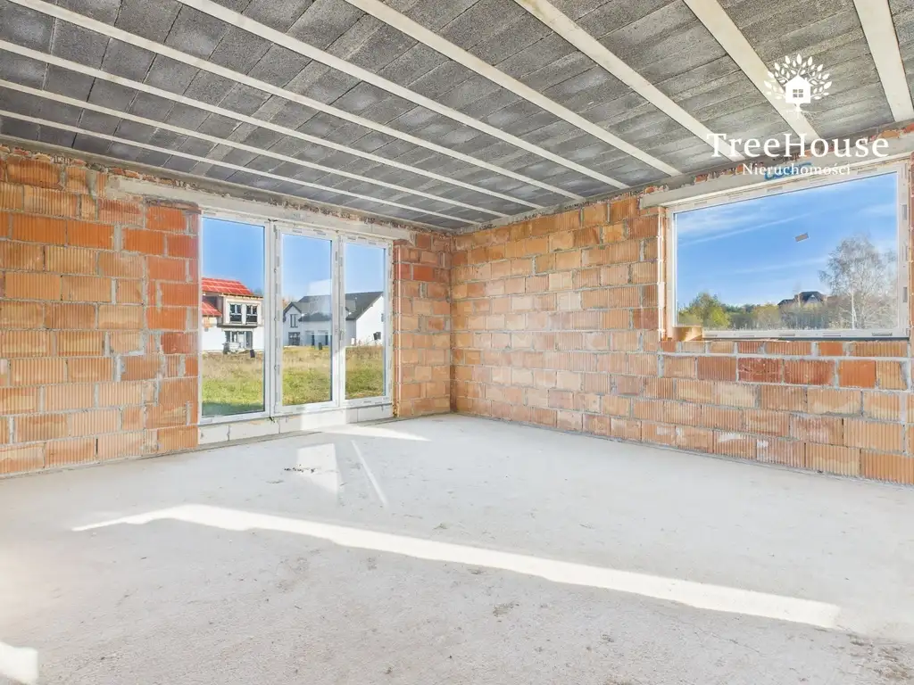 Dom w tradycyjnej technologii murowanej. Ściany zewnętrzne z pustaka ceramicznego typu Porotherm, ocieplenie ścian zewnętrznych styropianem 15 cm (λ 0,031). Strop gęstożebrowy Teriva 24cm, dach o konstrukcji drewnianej pokryty wysokiej jakości dachówką ceramiczną z kompletnym orynnowaniem. Okna PCV trzyszybowe, zapewniająca bardzo dobrą izolację cieplną i akustyczną. Elewacja wykończona tynkiem silikonowym o podwyższonej odporności na zabrudzenia. W projekcie przewidziano wentylację mechaniczną z rekuperacją. Do budynku doprowadzone są przyłącza prądu, wody, kanalizacji i gazu — instalacje wewnętrzne gotowe do rozprowadzenia zgodnie z Twoim projektem funkcjonalnym. Garaż w bryle budynku z automatyczną bramą.