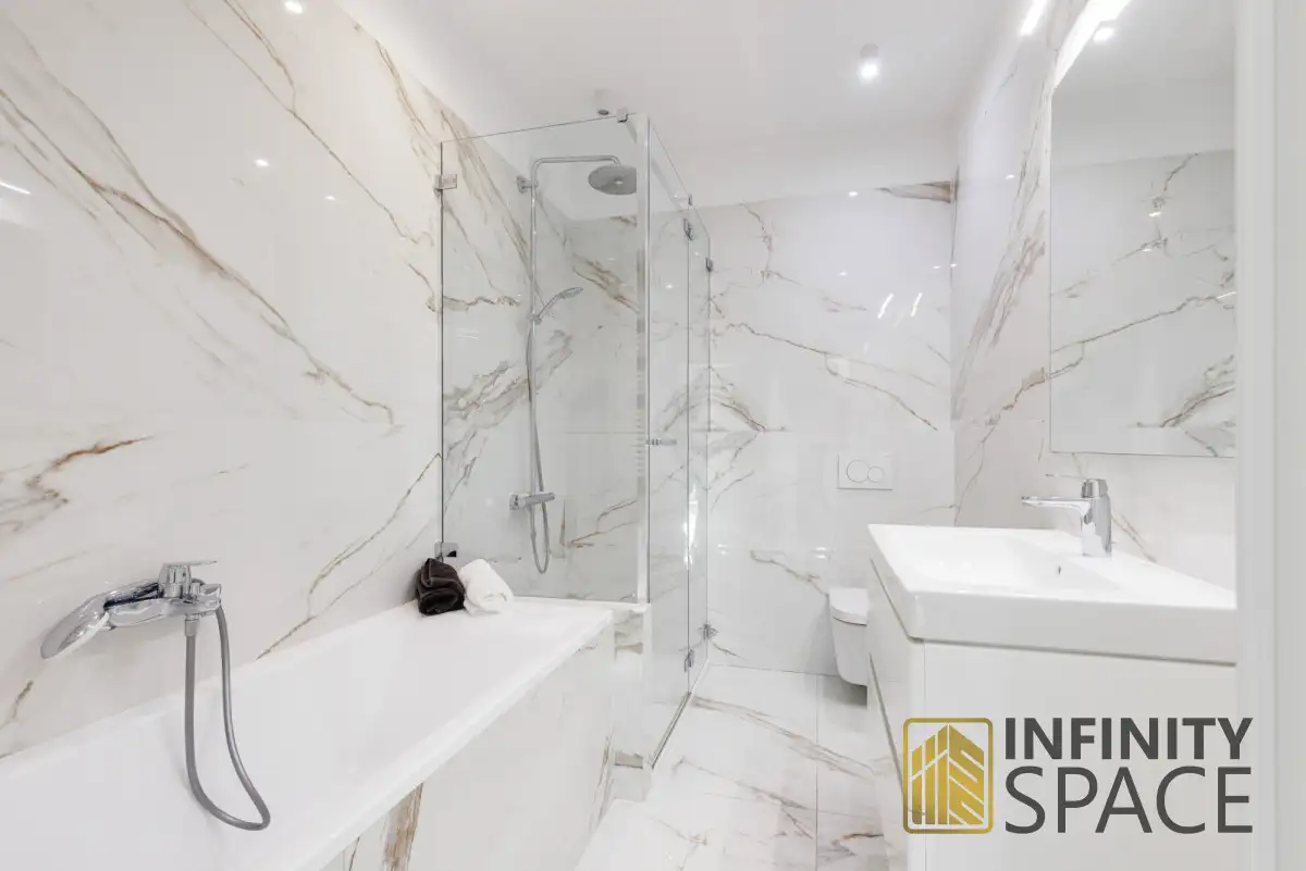 - łazienki z dużą wanną, oddzielnym prysznicem i WC,