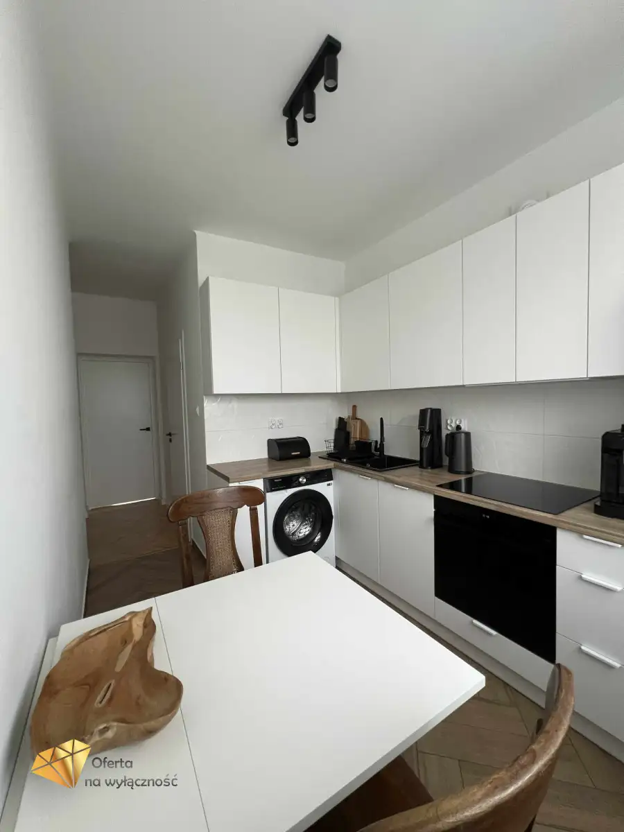 Mieszkanie wyposażone w zabudowę kuchenną wykonaną przez stolarza , która posiada sprzęty AGD takie jak: piekarnik, płyta indukcyjna, lodówka, zmywarka.