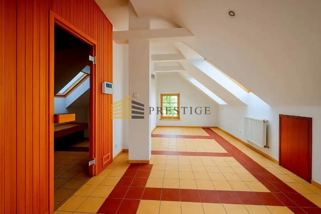 Przestronne poddasze mieści dodatkową sypialnię, pokój studio, saunę oraz prywatną łazienkę, tworząc doskonałą strefę relaksu i prywatności.