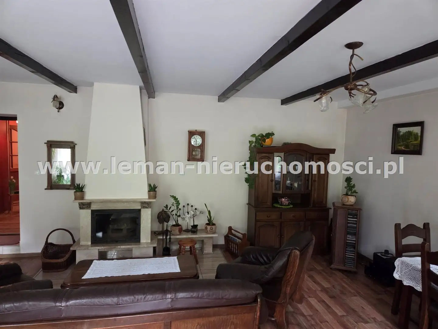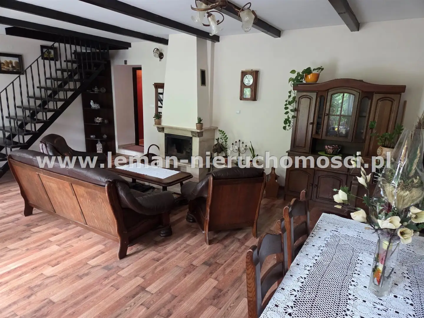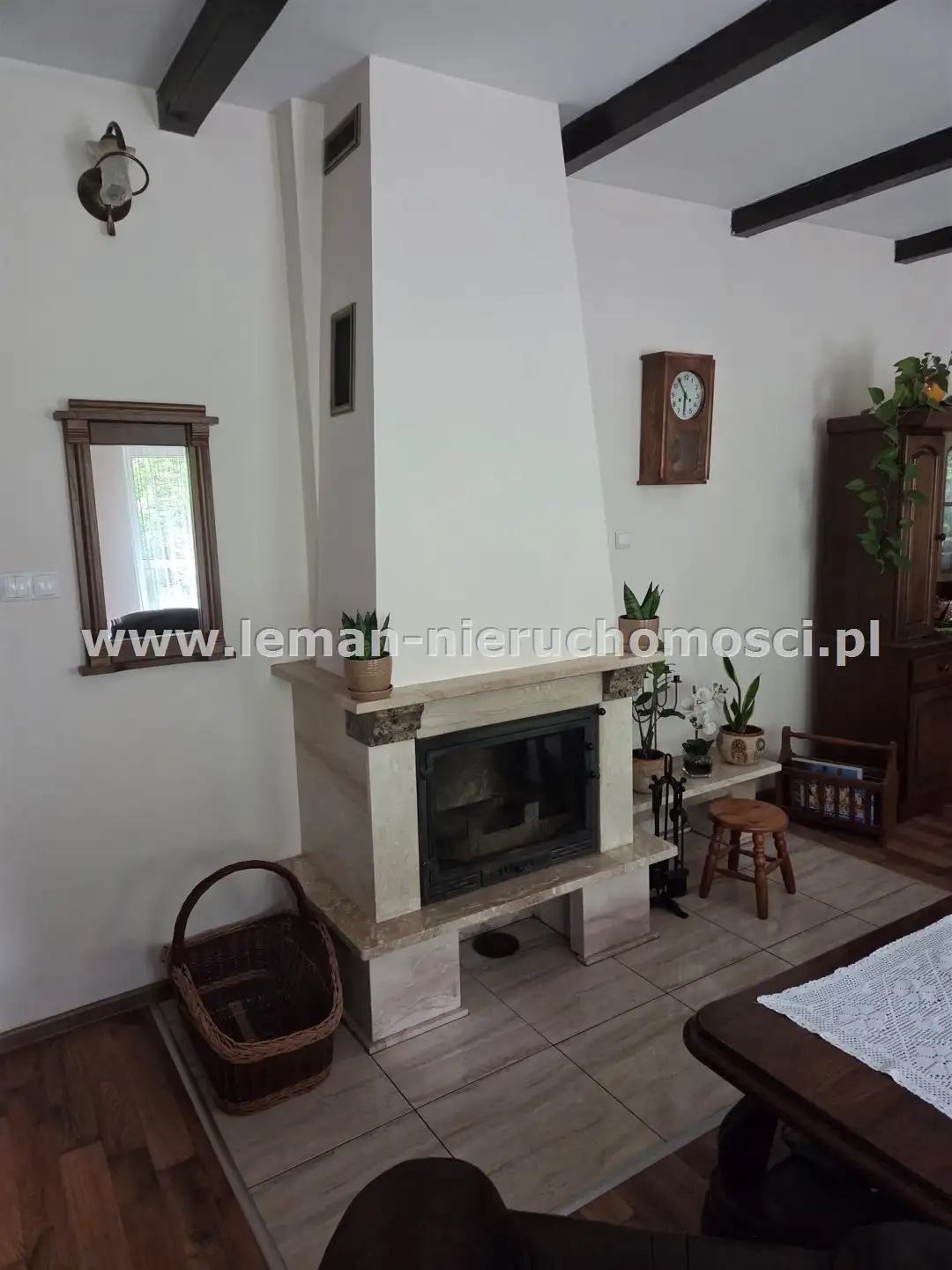 PARTER: ok. 135m², salon o pow. 36m² z kominkiem i schodami na piętro, sypialnia główna 23m², pokój 18m², widna, osobna kuchnia, 2 łazienki: jedna z wanną, druga z kabiną prysznicową, pomieszczenie gospodarcze (kuchnia robocza) i kotłownia. Na podłogach są panele, w łazienkach płytki.