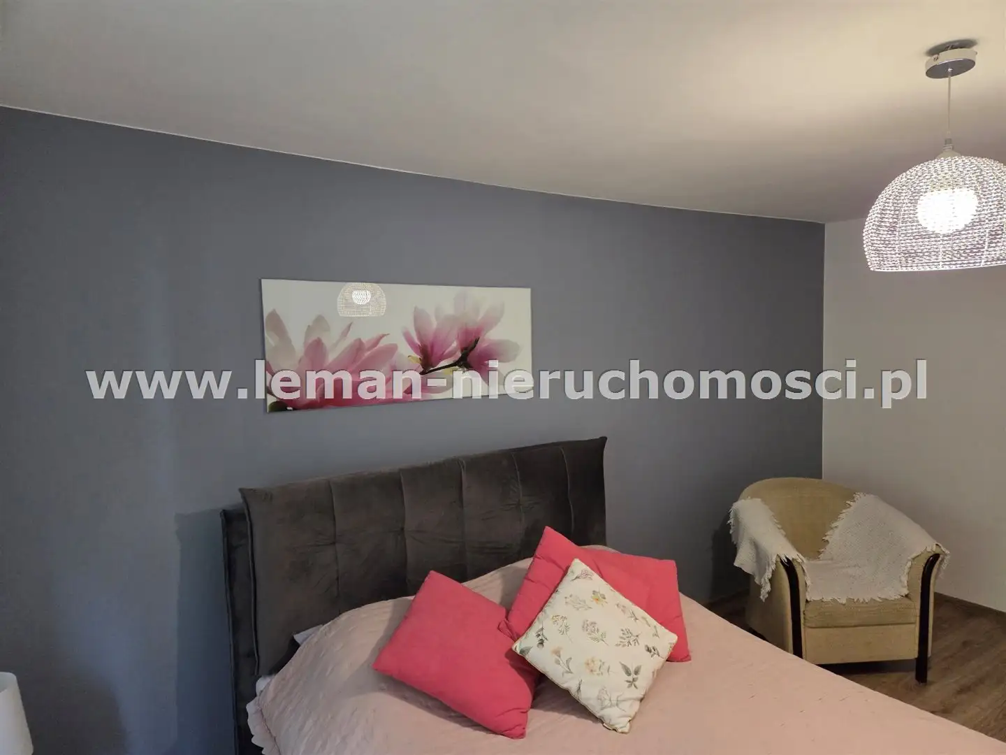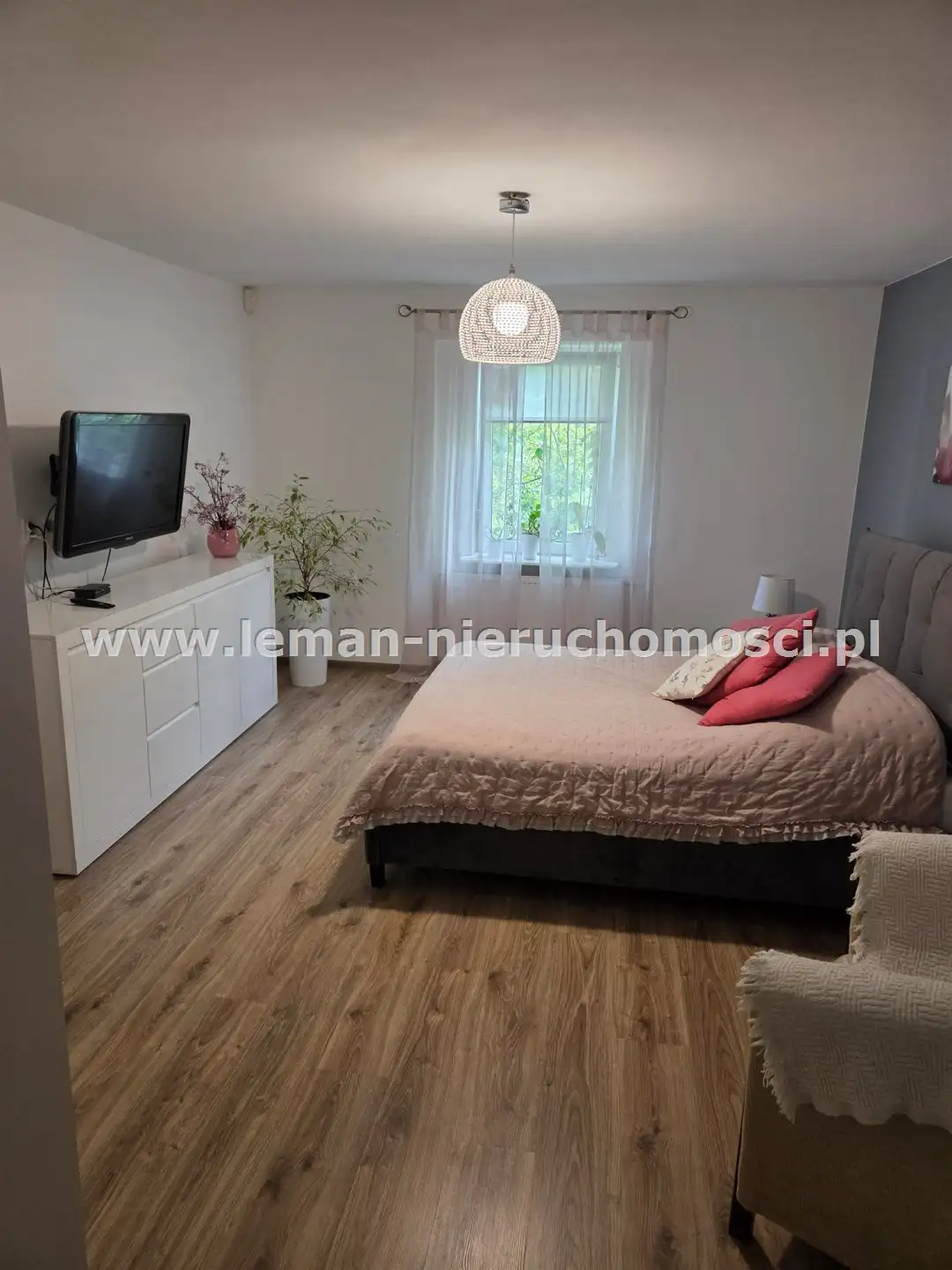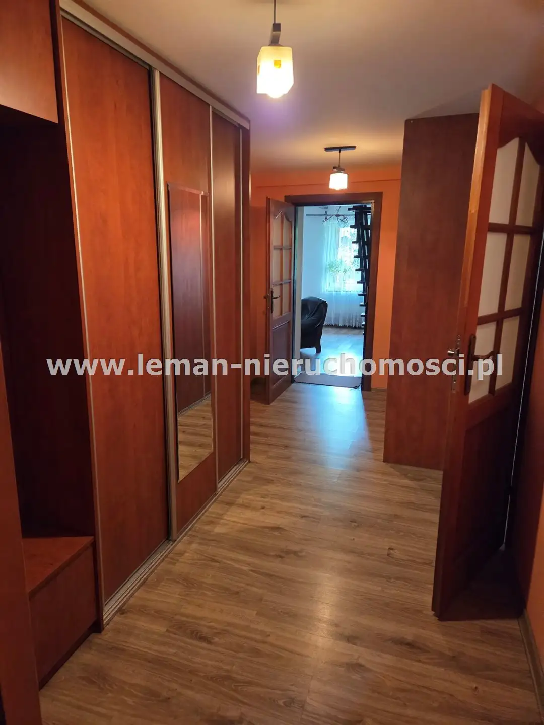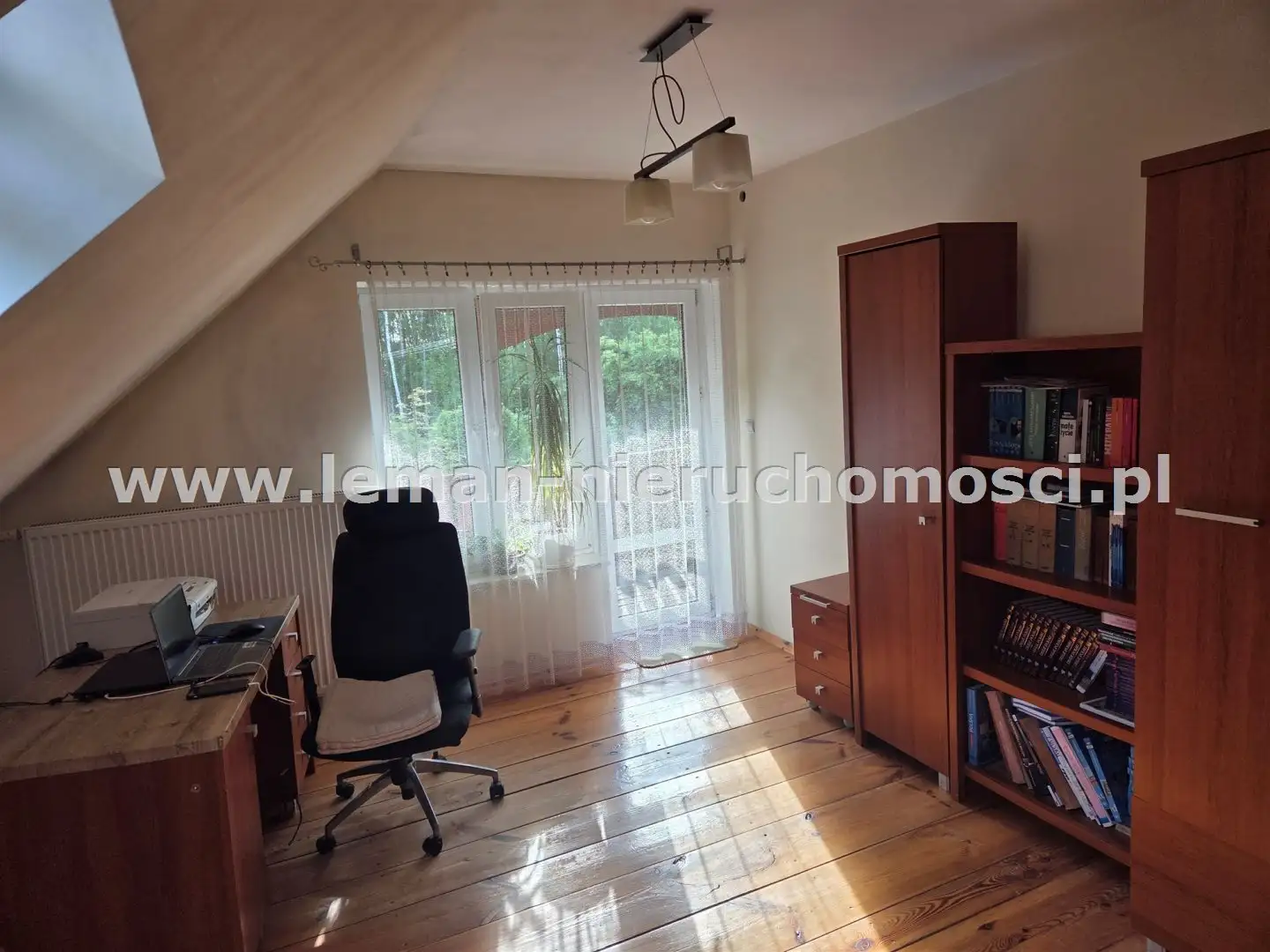 PARTER: ok. 135m², salon o pow. 36m² z kominkiem i schodami na piętro, sypialnia główna 23m², pokój 18m², widna, osobna kuchnia, 2 łazienki: jedna z wanną, druga z kabiną prysznicową, pomieszczenie gospodarcze (kuchnia robocza) i kotłownia. Na podłogach są panele, w łazienkach płytki.