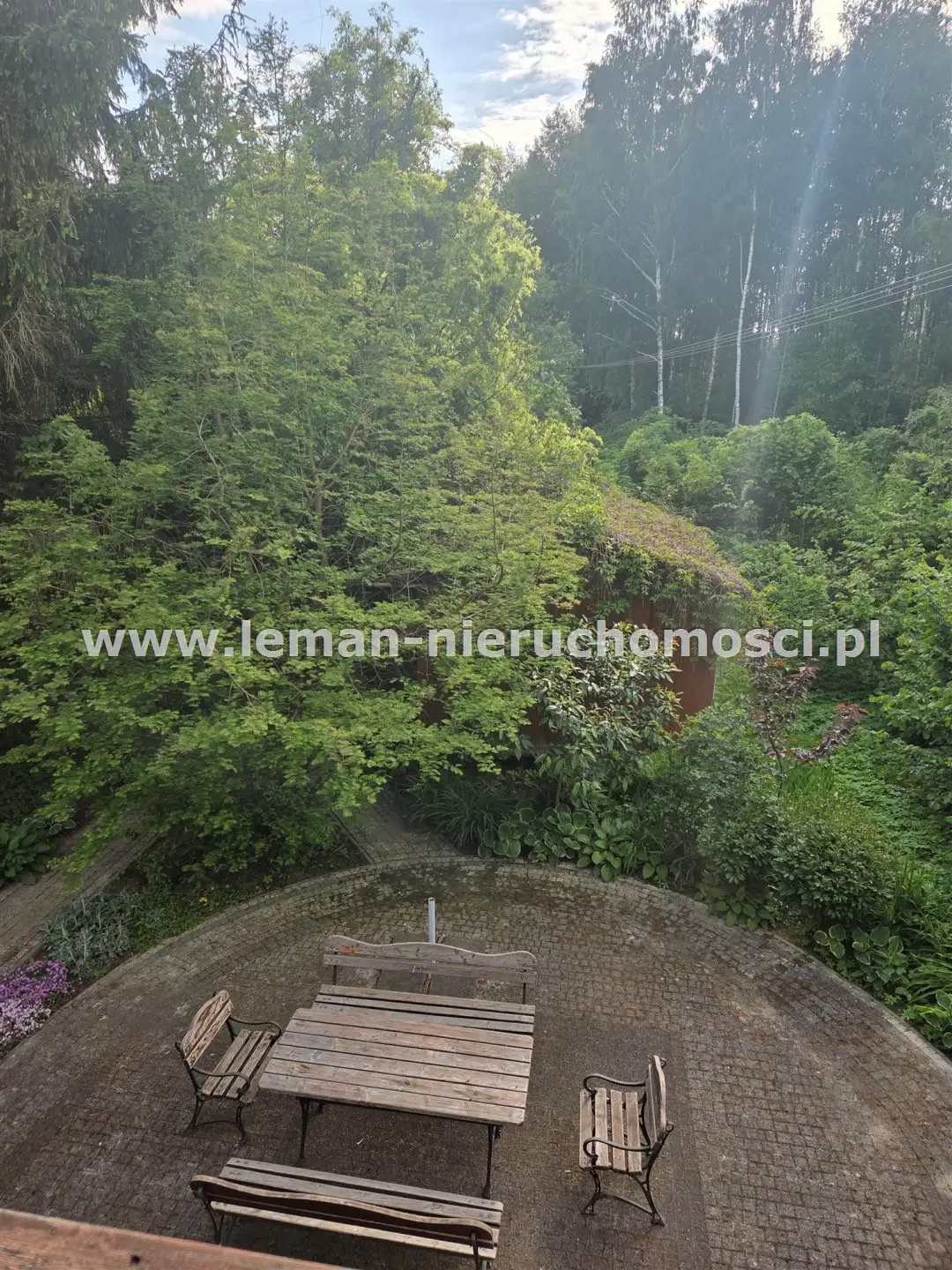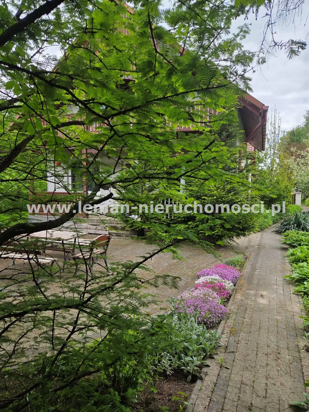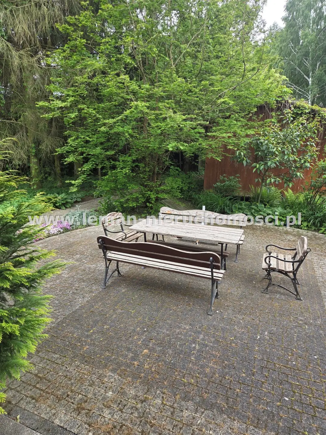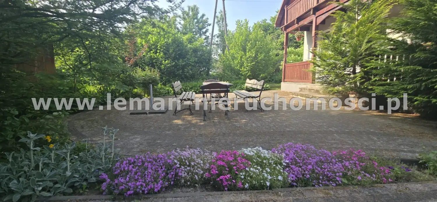 Z salonu wychodzi się na duży, wybrukowany, zachodni taras otoczony ogrodem. Idąc w kierunku stawu mijamy jeszcze murowany grill obok altany a także miejsce spotkań przy stole. Także przed domem znajduje się zadaszony taras utwardzony kostką brukową w otoczeniu pachnących bzów, magnolii i tulipanowców.
