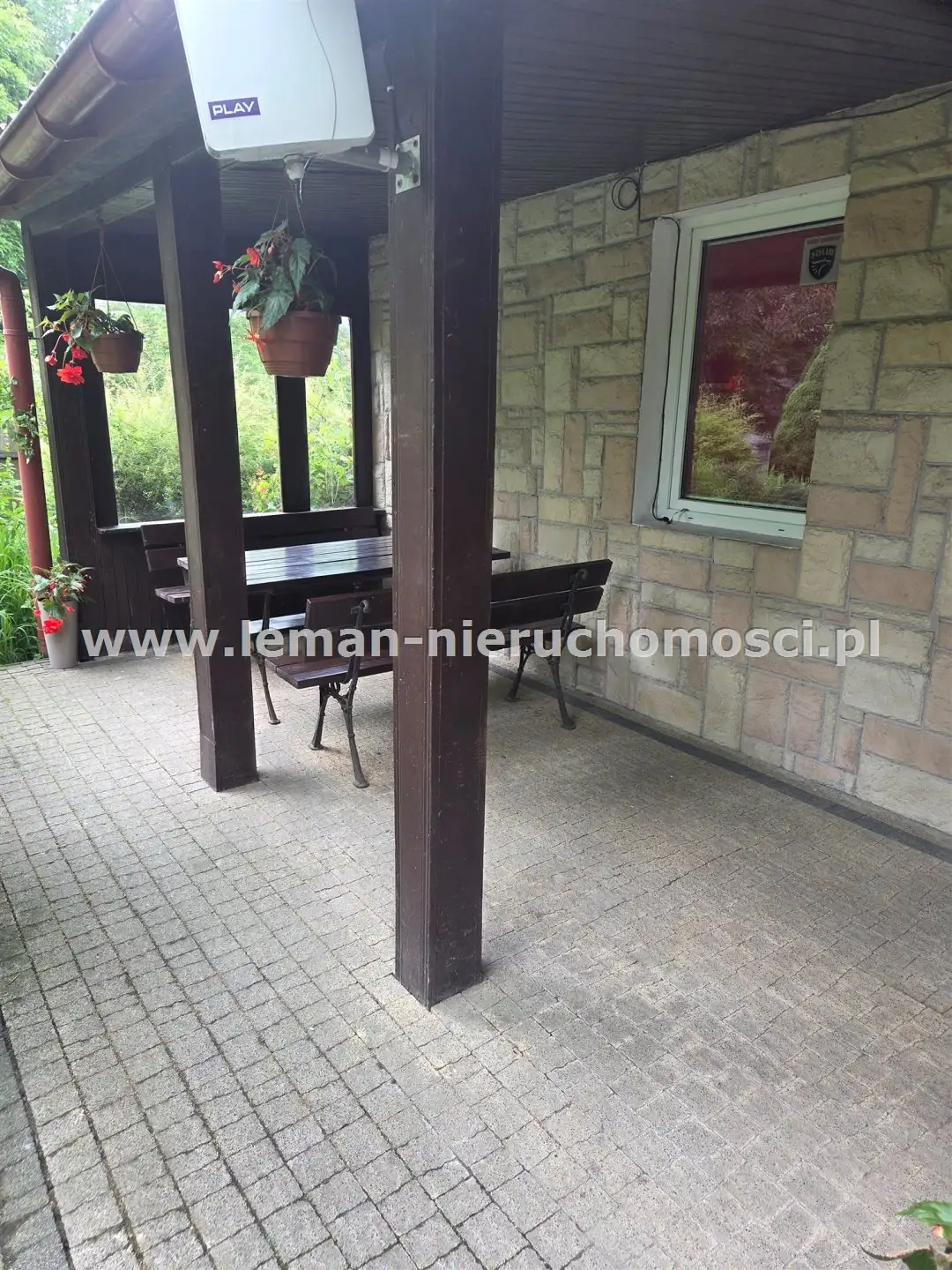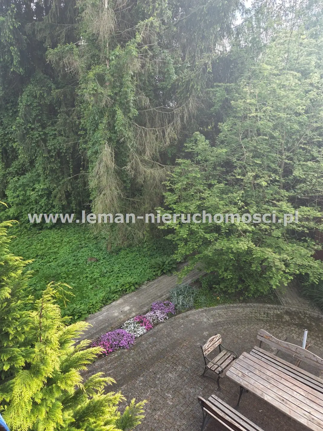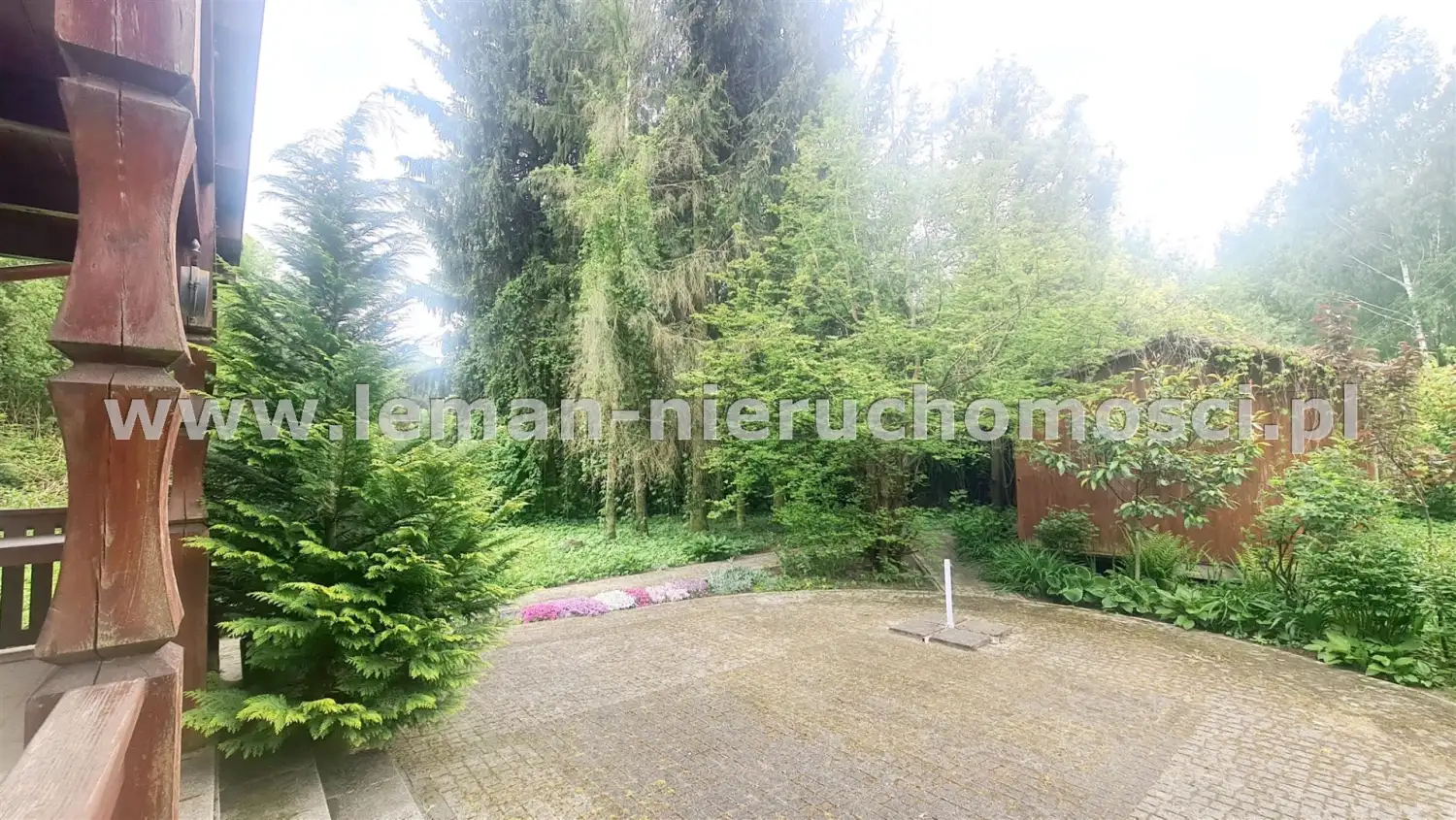 Z salonu wychodzi się na duży, wybrukowany, zachodni taras otoczony ogrodem. Idąc w kierunku stawu mijamy jeszcze murowany grill obok altany a także miejsce spotkań przy stole. Także przed domem znajduje się zadaszony taras utwardzony kostką brukową w otoczeniu pachnących bzów, magnolii i tulipanowców.