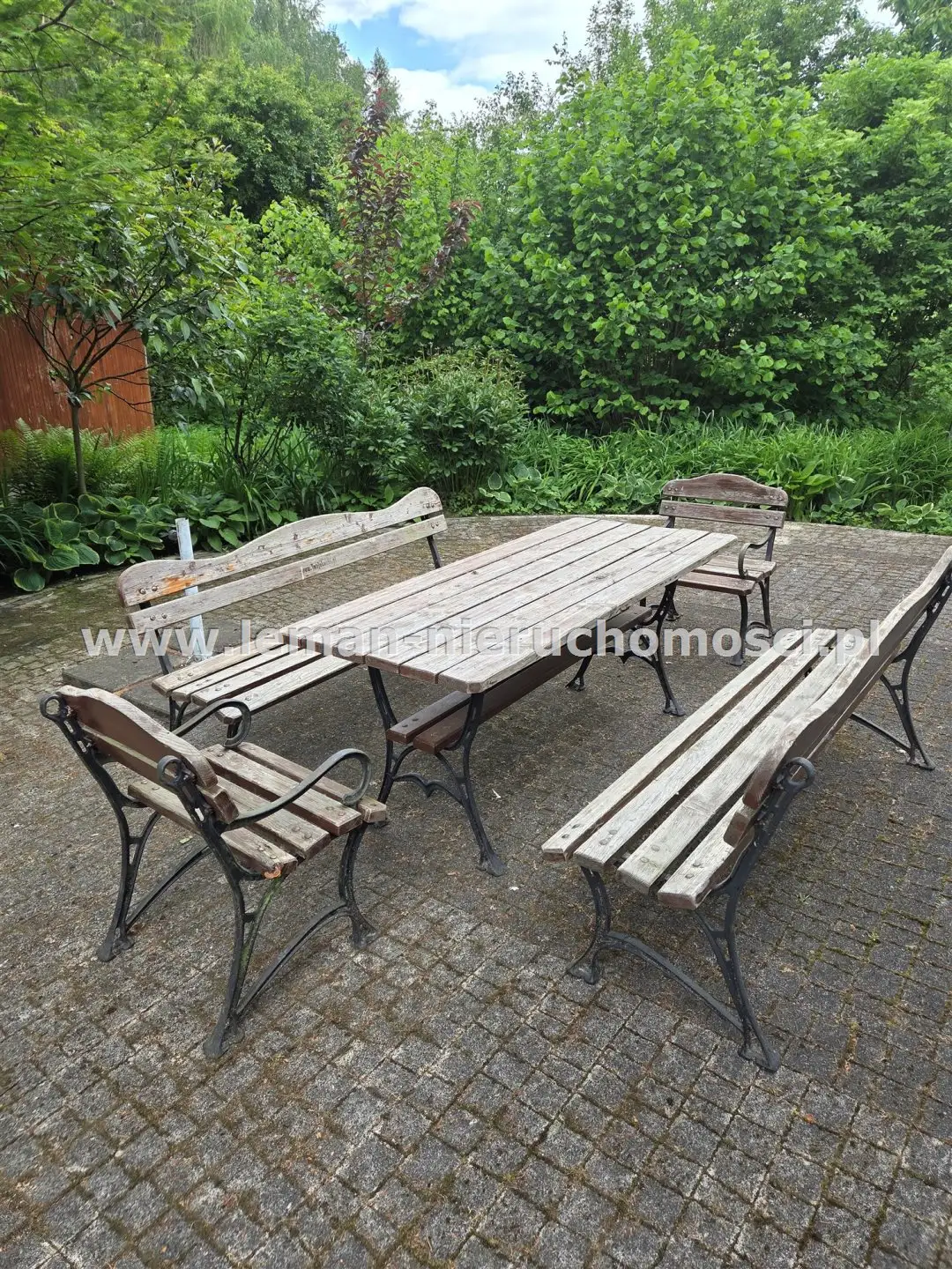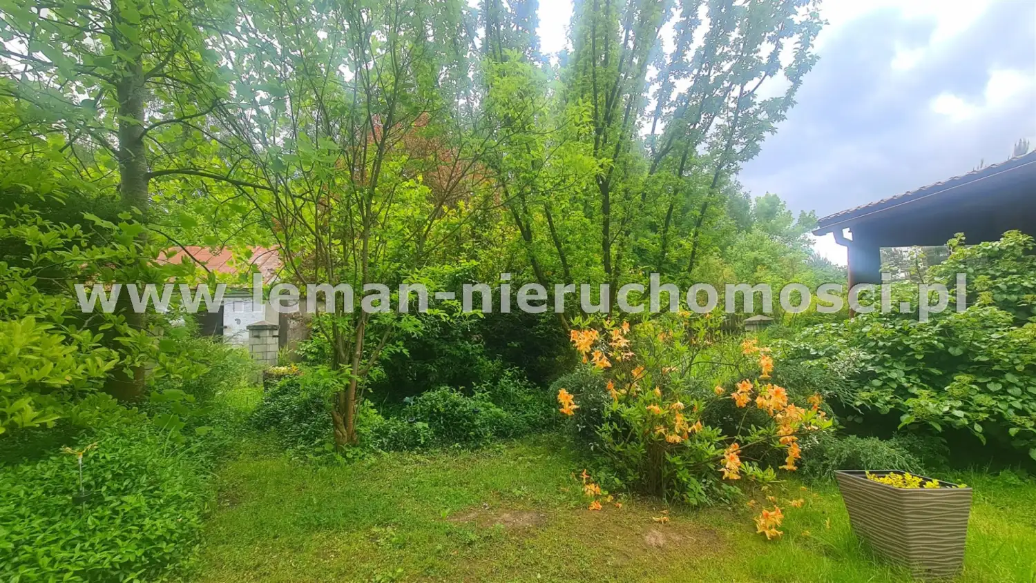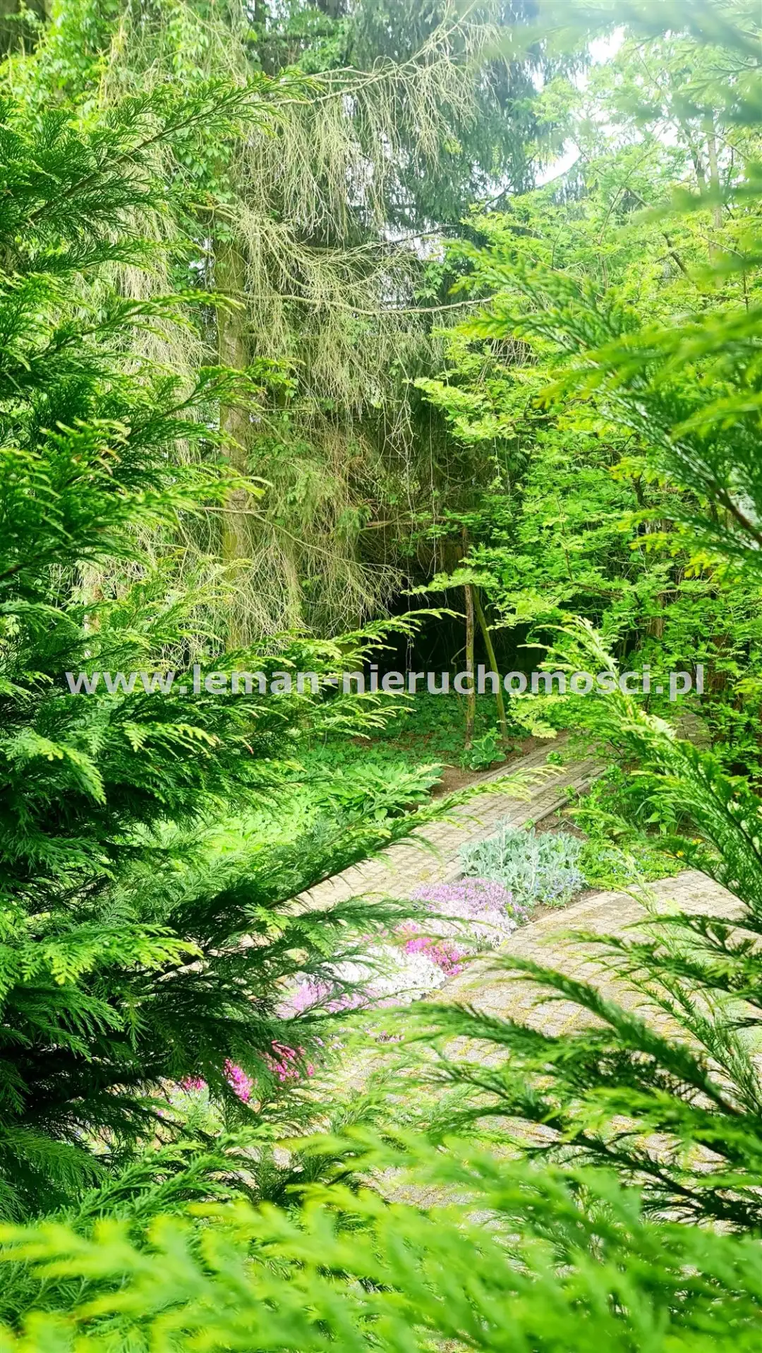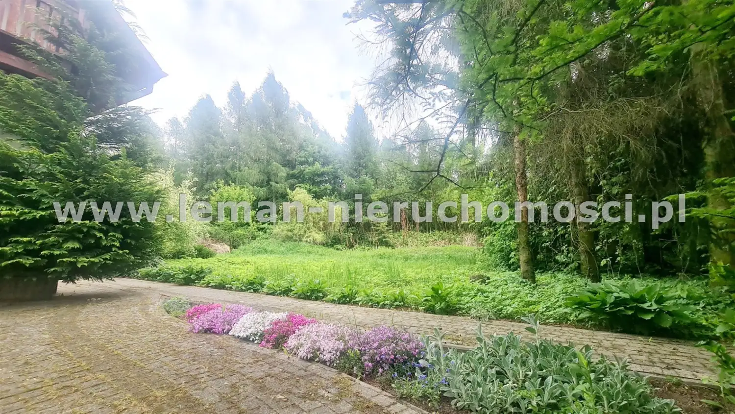 Z salonu wychodzi się na duży, wybrukowany, zachodni taras otoczony ogrodem. Idąc w kierunku stawu mijamy jeszcze murowany grill obok altany a także miejsce spotkań przy stole. Także przed domem znajduje się zadaszony taras utwardzony kostką brukową w otoczeniu pachnących bzów, magnolii i tulipanowców.