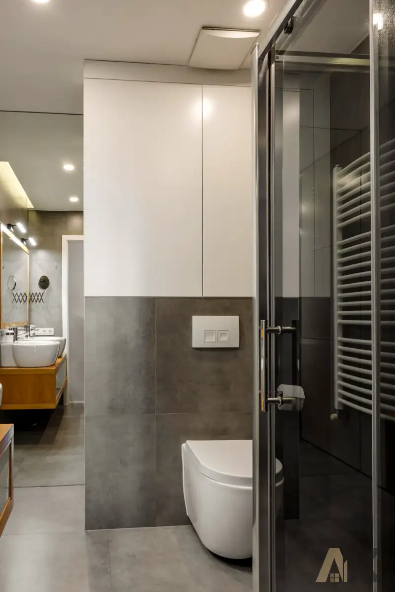 Łazienka: Szafka umywalkowa, kabina prysznicowa, zapewniająca maksymalny komfort użytkowania, pralka