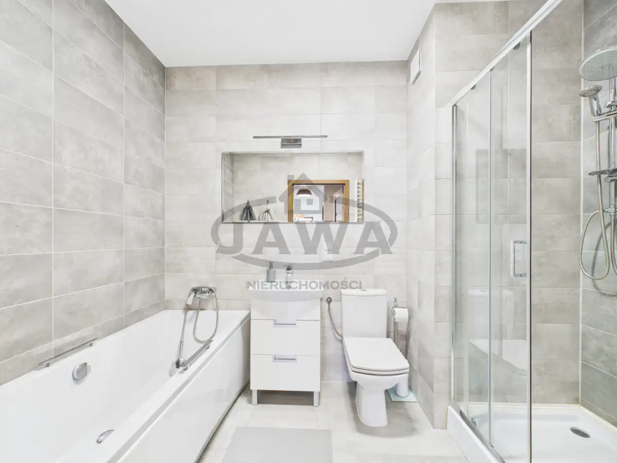 Łazienka - przestronna, o powierzchni ponad 5 m², z nowoczesnym wyposażeniem, które łączy funkcjonalność z elegancją. Znajduje się tu zarówno wanna, idealna do relaksu po ciężkim dniu, jak i kabina prysznicowa dla tych, którzy cenią szybkie orzeźwienie. Całość utrzymana w stonowanej kolorystyce, co tworzy przestronną, przyjemną atmosferę.