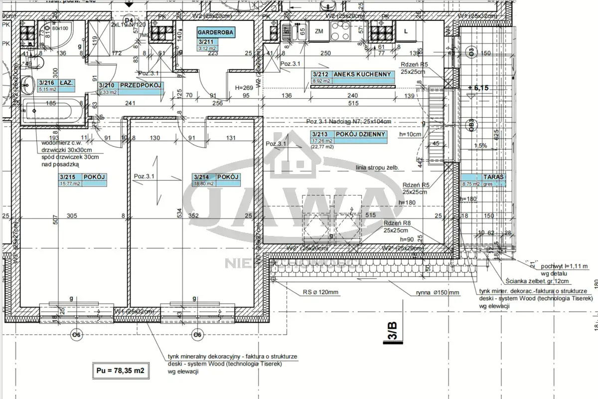 Salon z aneksem kuchennym - razem przestrzeń 32 m². Salon przestronny i pełen światła. W tym miejscu z powodzeniem łączą się funkcje wypoczynkowe i strefa relaksu. Skos w części dziennej dodaje uroku i sprawia, że pomieszczenie nabiera charakteru. Okna w skośnej ścianie dodatkowo doświetlają wnętrze, wprowadzając naturalne światło, co potęguje uczucie przestronności i sprawia, że pokój jest wyjątkowo przytulny.