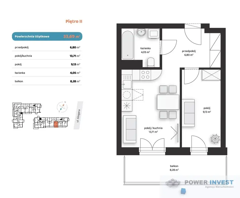 Mieszkanie znajduje się na parterze. Lokal ma powierzchnię 33,69 m² i składa się z: