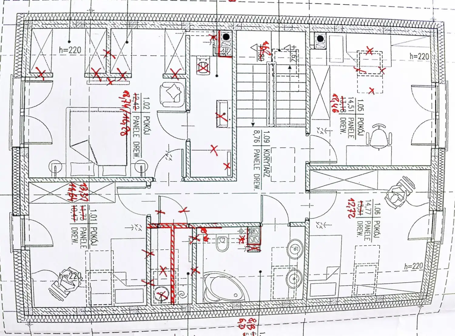 - podłoga: wylewka betonowa, izolacja posadzki na parterze styropian 15 cm, ogrzewanie podłogowe na obu poziomach,