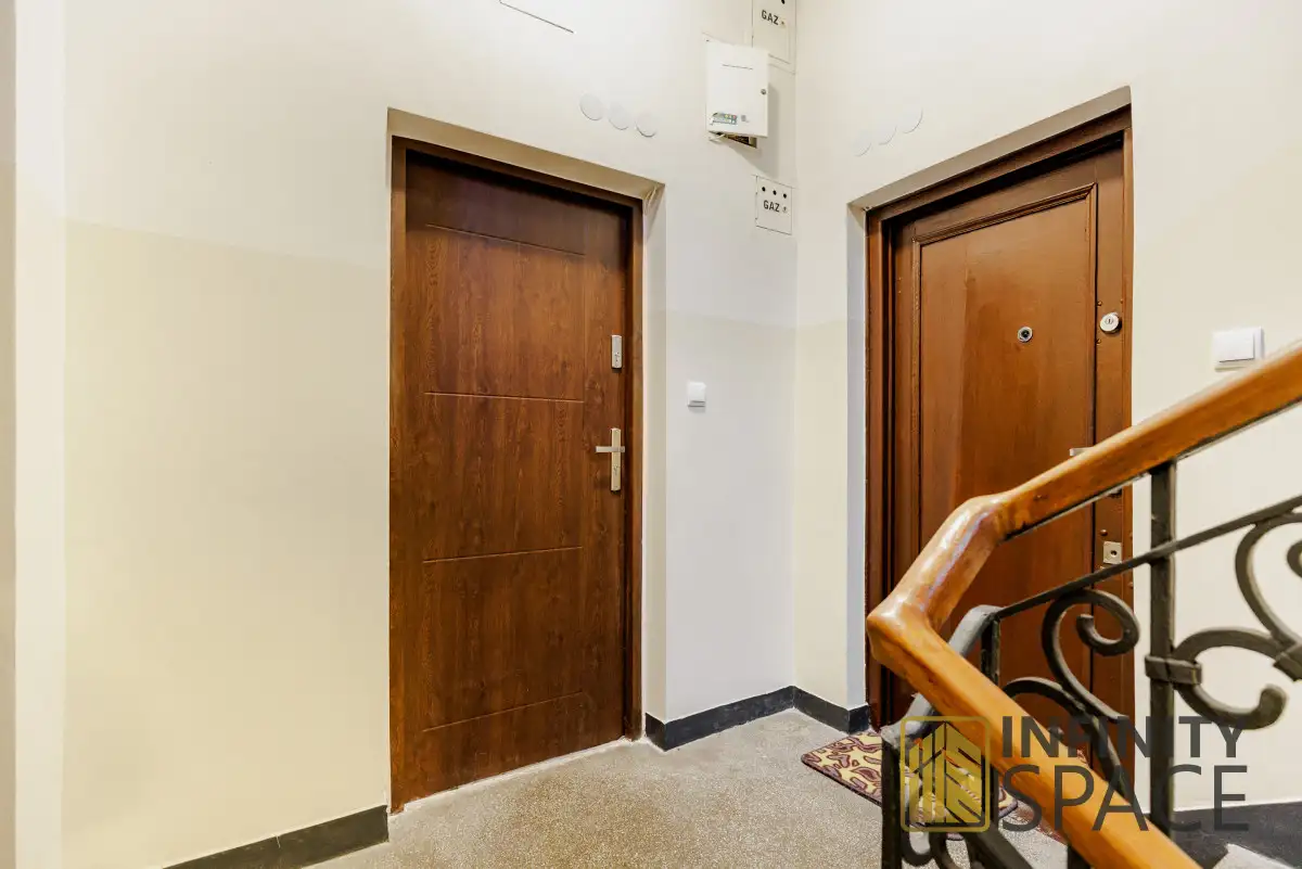 Mieszkanie, o powierzchni blisko 53 m², jest dwupokojowe z osobną kuchnią i łazienką. Ma przejrzysty układ i dobrą orientację wg. stron świata. Można je w prosty sposób zaadaptować do współczesnych standardów lub przeprojektować zamieniając w apartament, biuro adwokata czy gabinet psychologiczny. Jego wysokość czyli 3 m sprawia, że mieszkanie jest jeszcze bardziej przestrzenne. Ogrzewanie z sieci miejskiej, gaz, ciepła woda (piec gazowy).