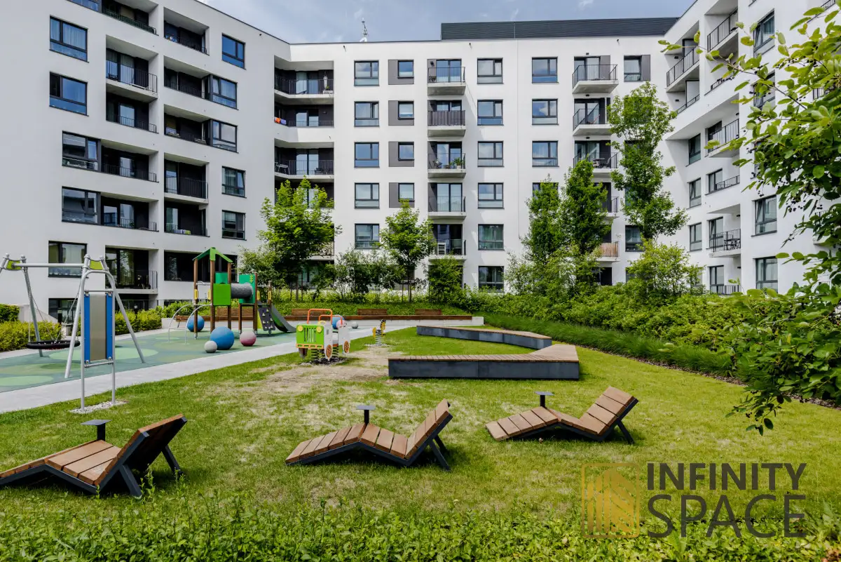 Budynek:Mieszkanie znajduje się w budynku oddanym do użytkowania w 2021 r.. Osiedle jest ogrodzone, z kontrolą dostępu oraz ochroną. Osiedle jest zadbane, z bujną zielenią i ładem przestrzennym.