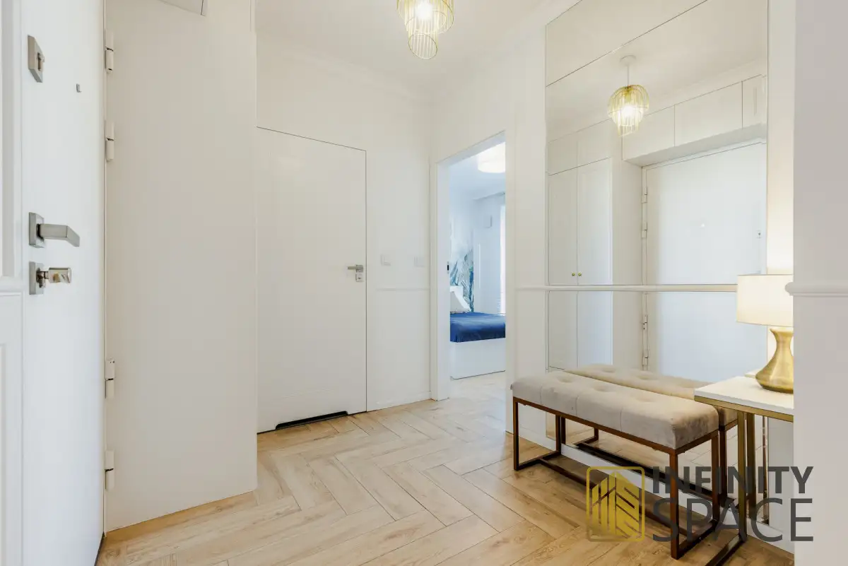 - przedpokój - komfortowa przestrzeń z szafą i miejscem do siedzenia.