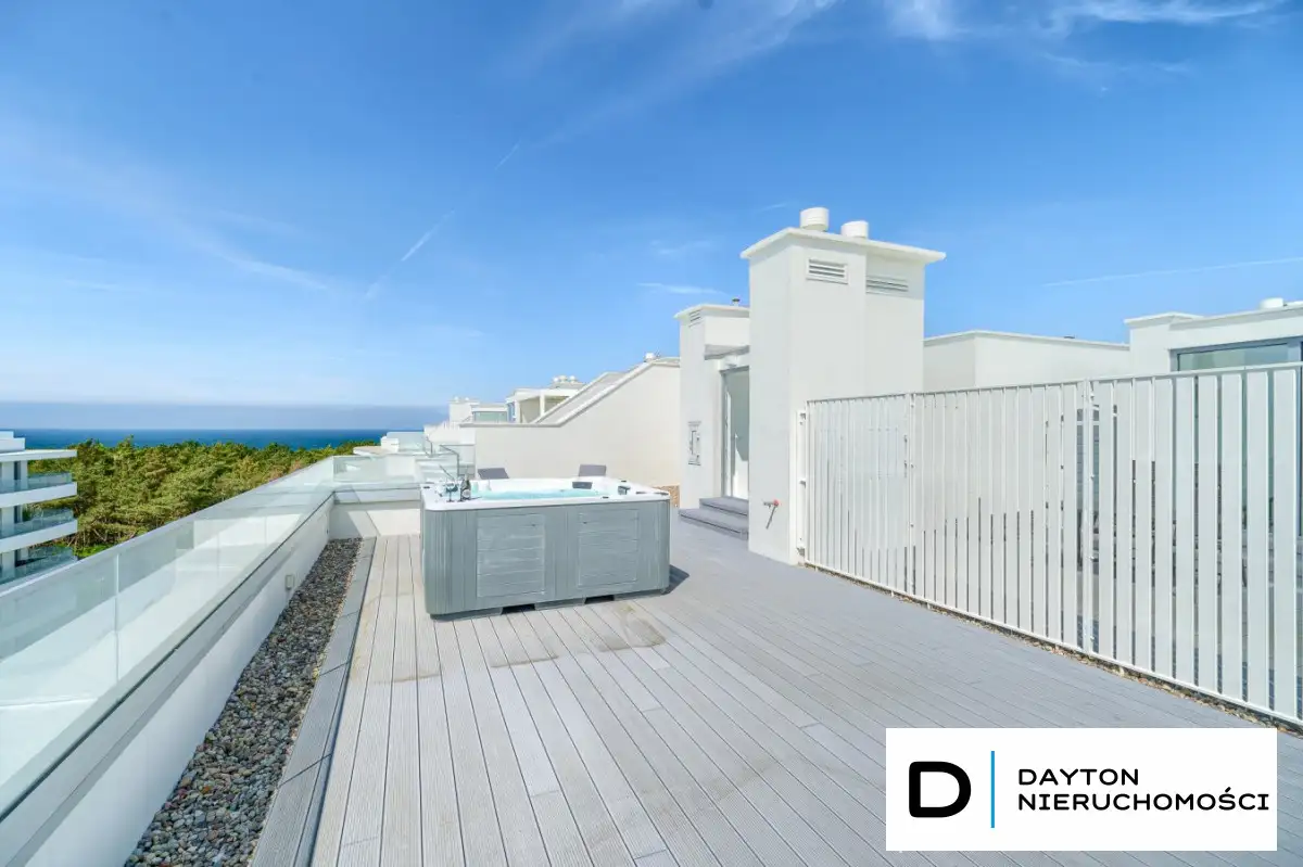- dużego tarasu z frontowym widokiem na jezioro oraz tarasu na dachu z jacuzzi i widokiem na jezioro oraz morze,