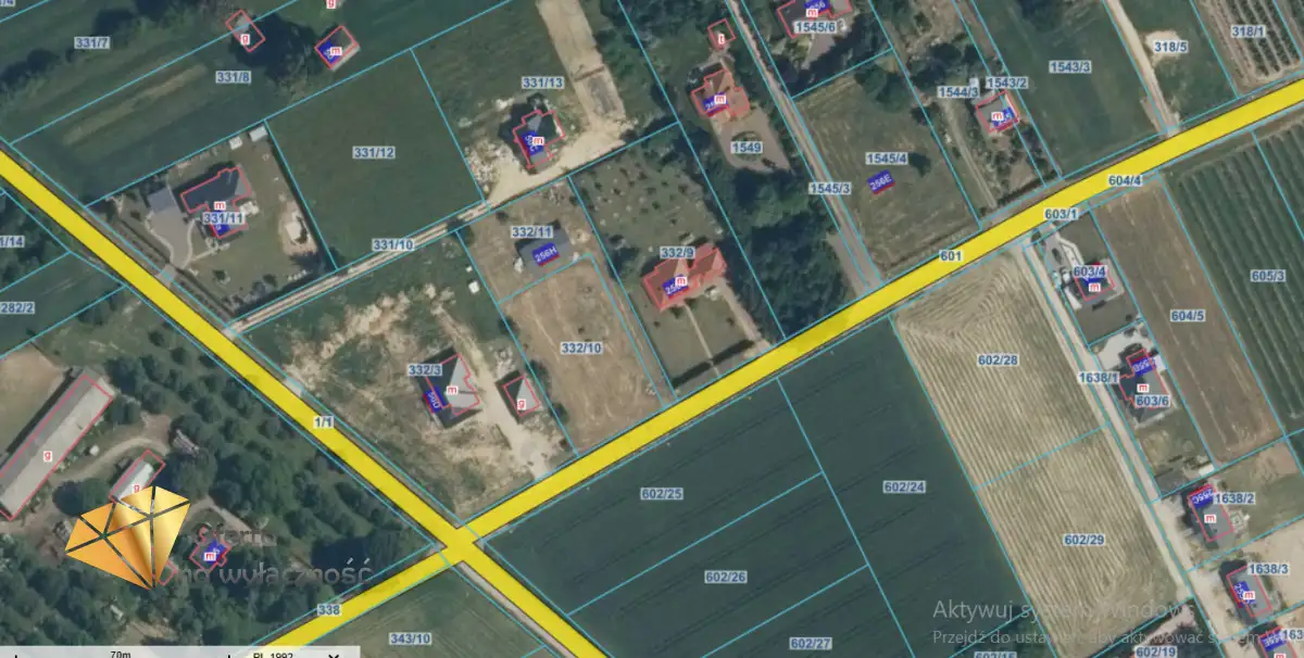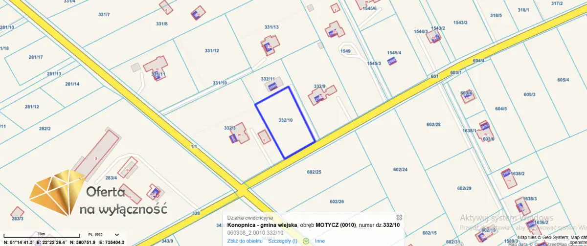Działka o nr 332/10 w pierwszej linii zabudowy przy gminnej drodze asfaltowej.