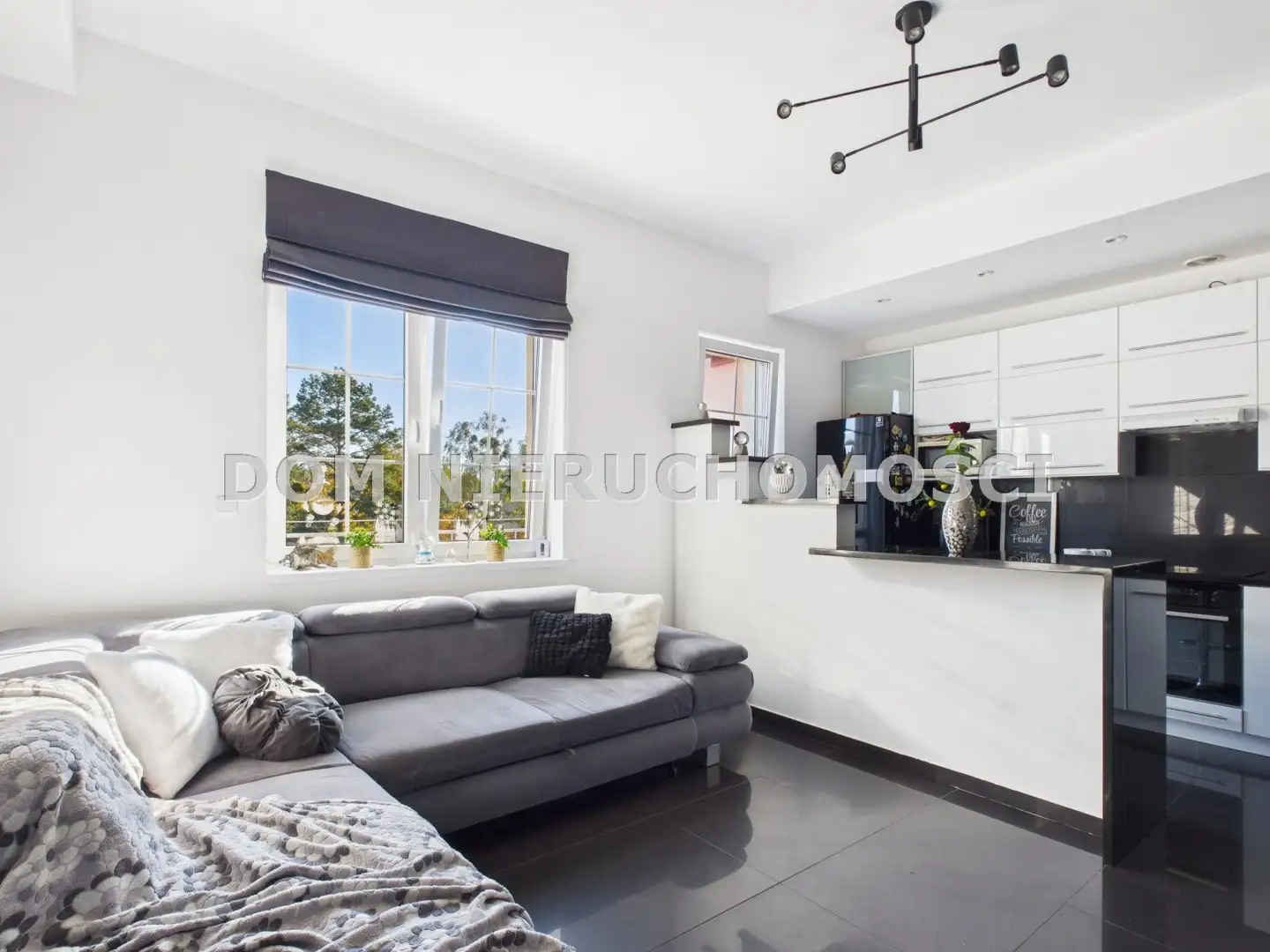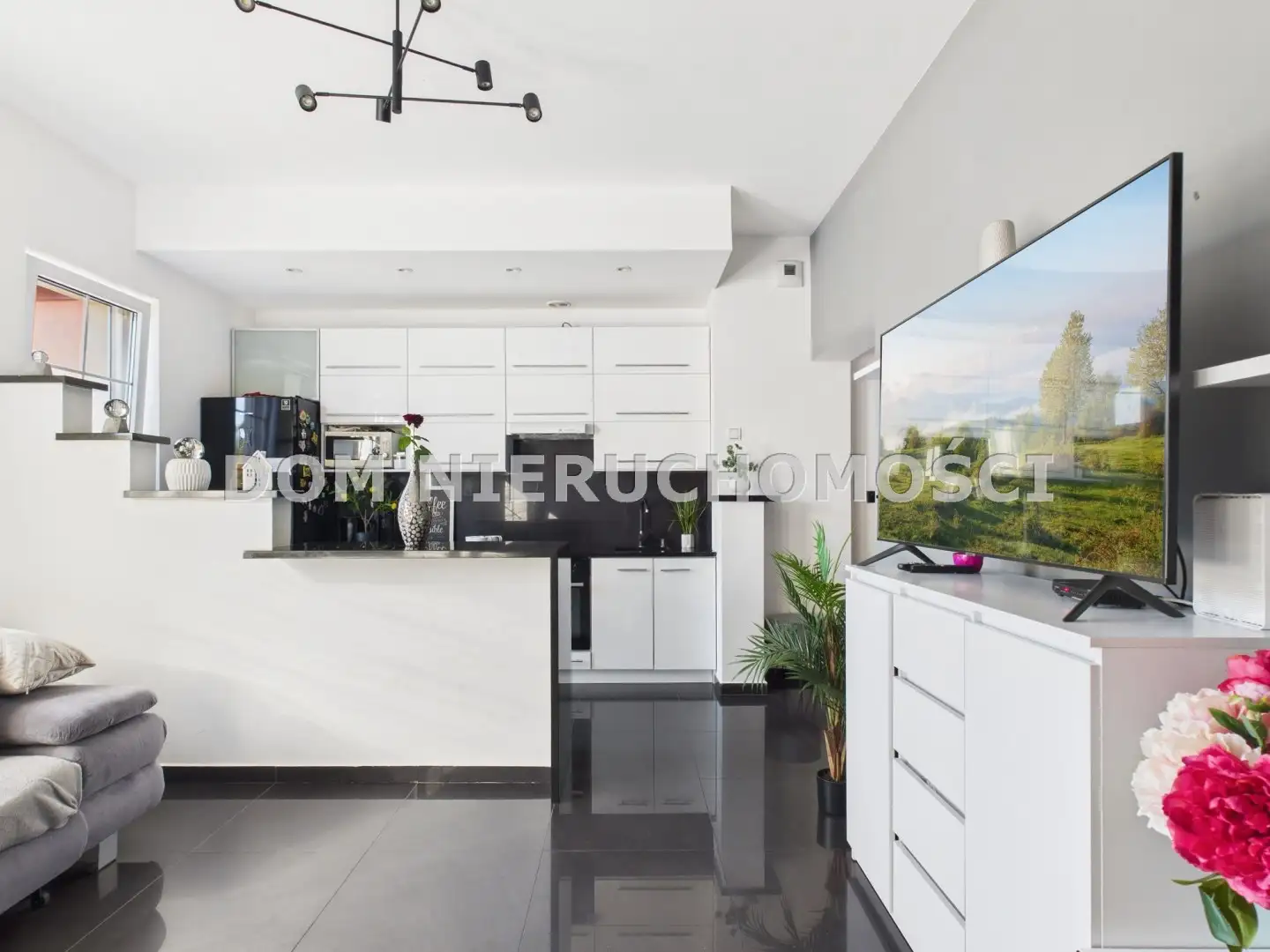 salon z aneksem kuchennym i wyspą,