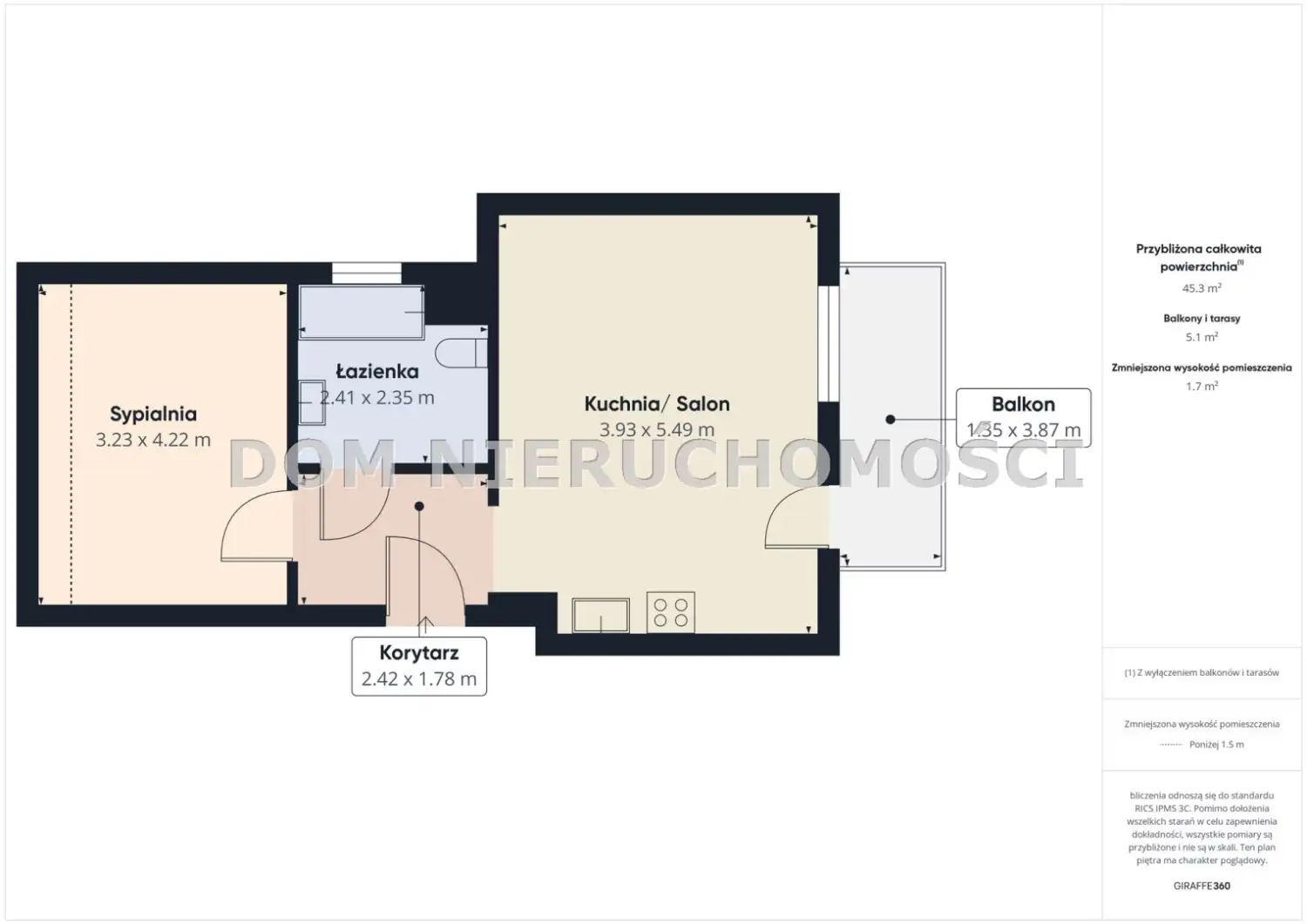 Powierzchnia mieszkania wynosi 42,2 m² , a w jego skład wchodzą: