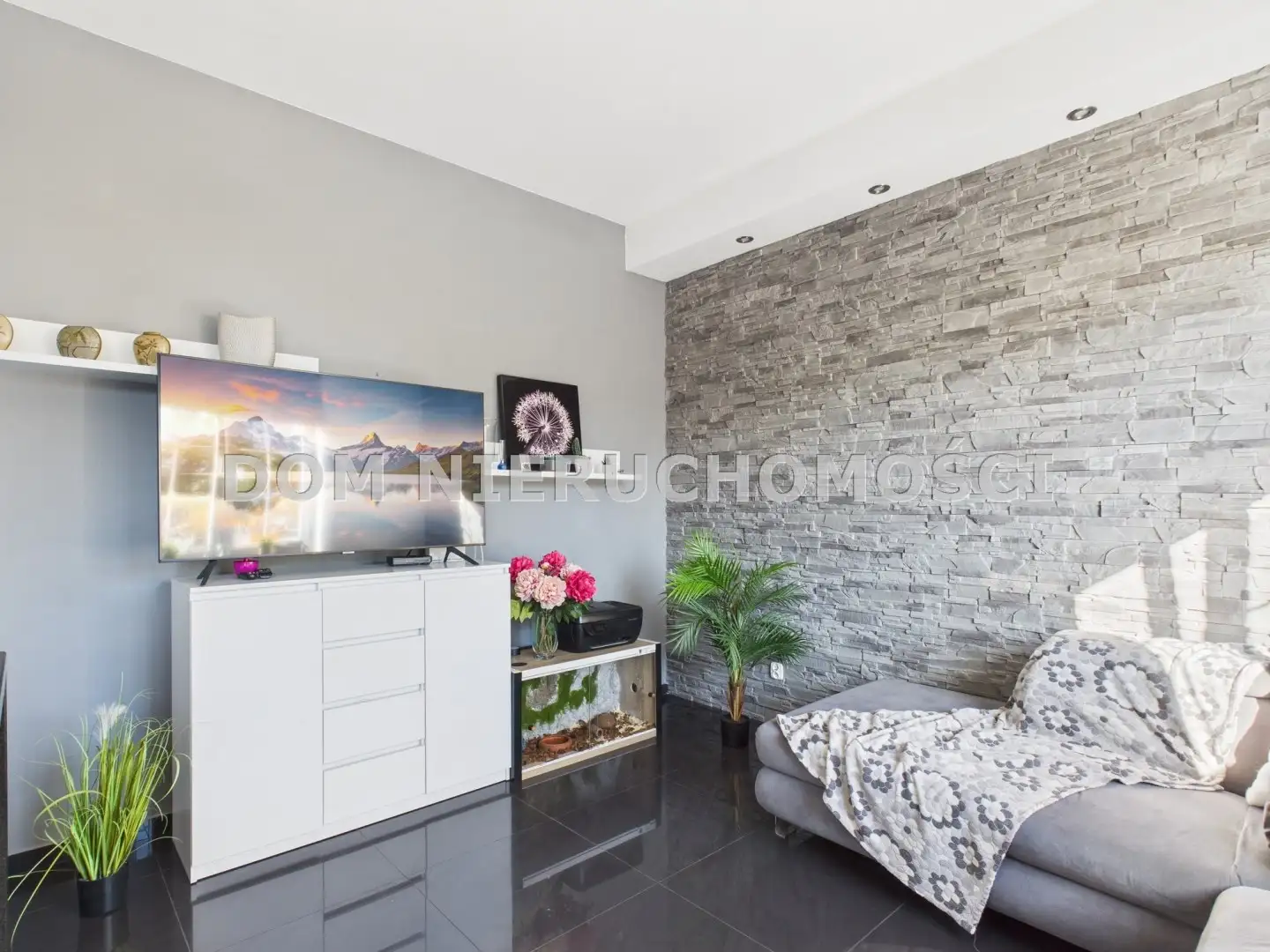 Na podłogach w salonie i przedpokoju położono płytki, w sypialni panele, natomiast w łazience - glazurę.