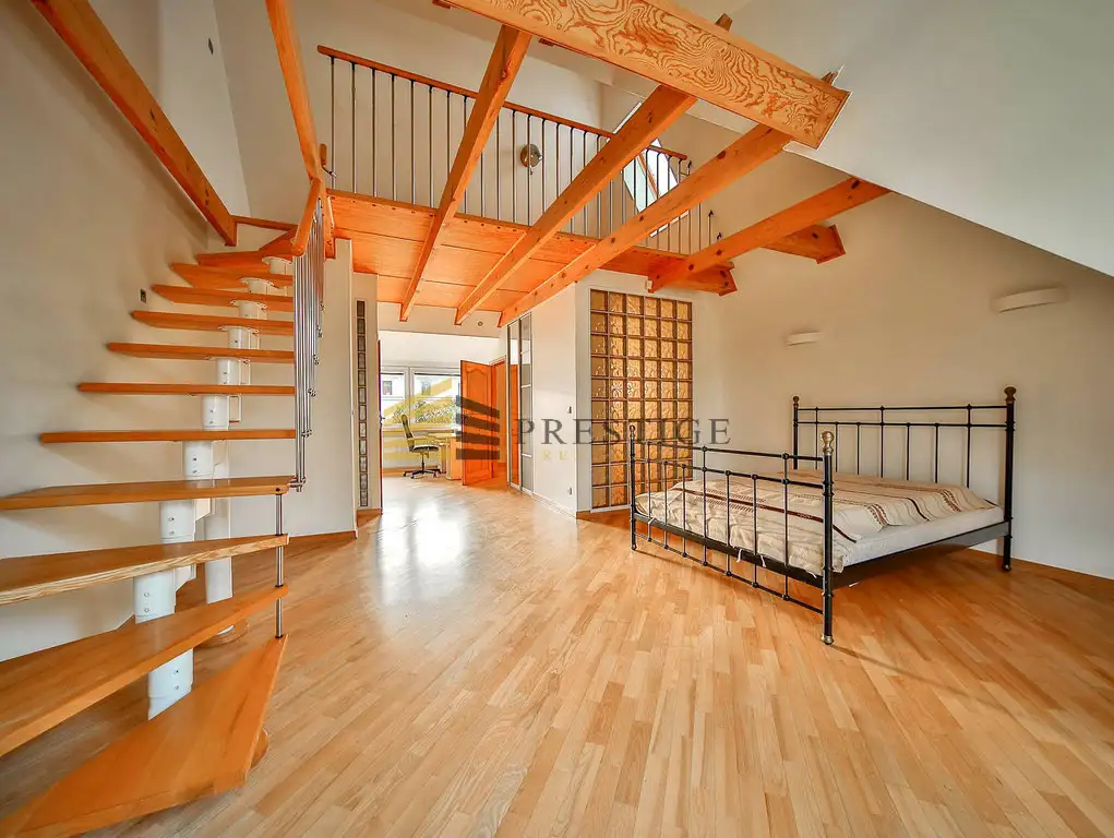 - Wysoki pokój (ok. 35 m²) z dużymi oknami porte-fenetre, antresolą (17 m²) oraz szafą wnękową.
