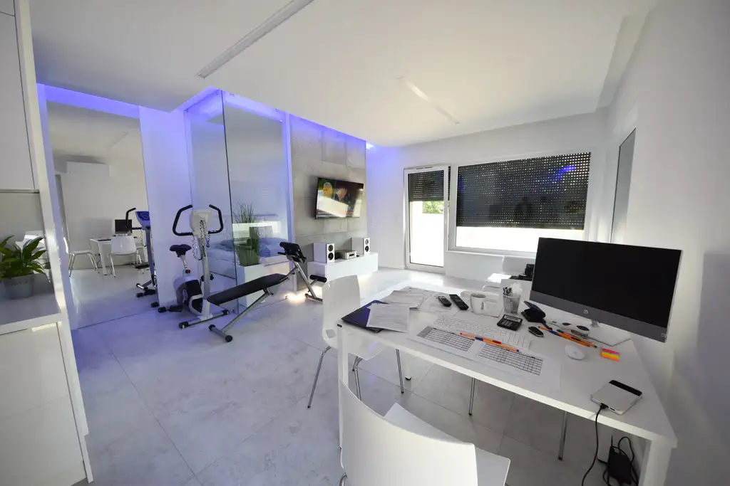 Wykończenie: okna: PCV z elektrycznymi roletami zewnętrznymi; na ścianach: gładzie. Podłogi wyłożone wysokogatunkowym gresem. Drzwi zewnętrzne: antywłamaniowe, drzwi wewnętrzne z zamkami magnetycznymi.