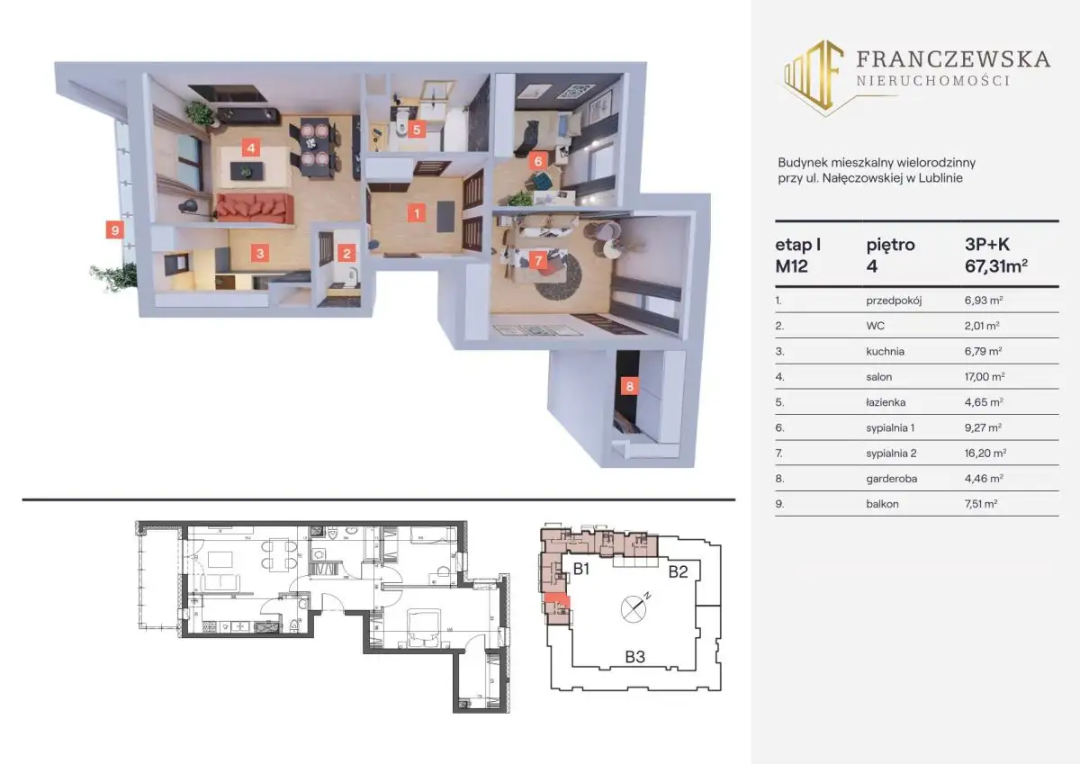 Dwustronne, trzypokojowe mieszkanie o powierzchni projektowej 67,35 m² z wystawą okien na północny-wschód i południowy-zachód.