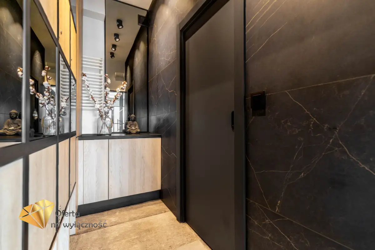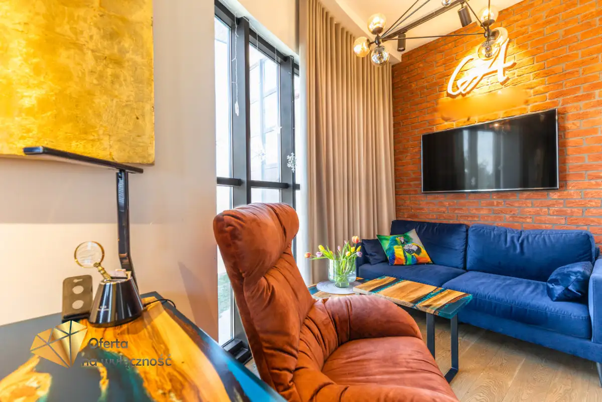 - sufit napinany, naturalna cegła, drewniany parkiet,