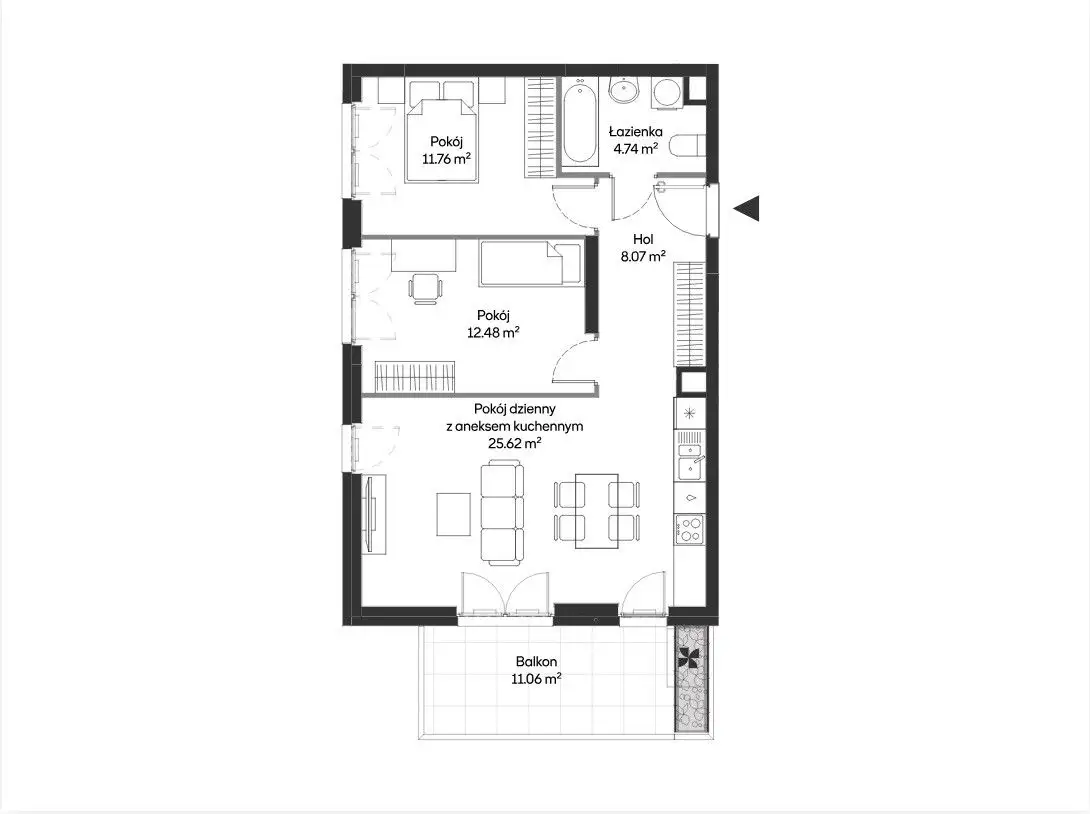 Układ mieszkania:- pokój dzienny z aneksem kuchennym,