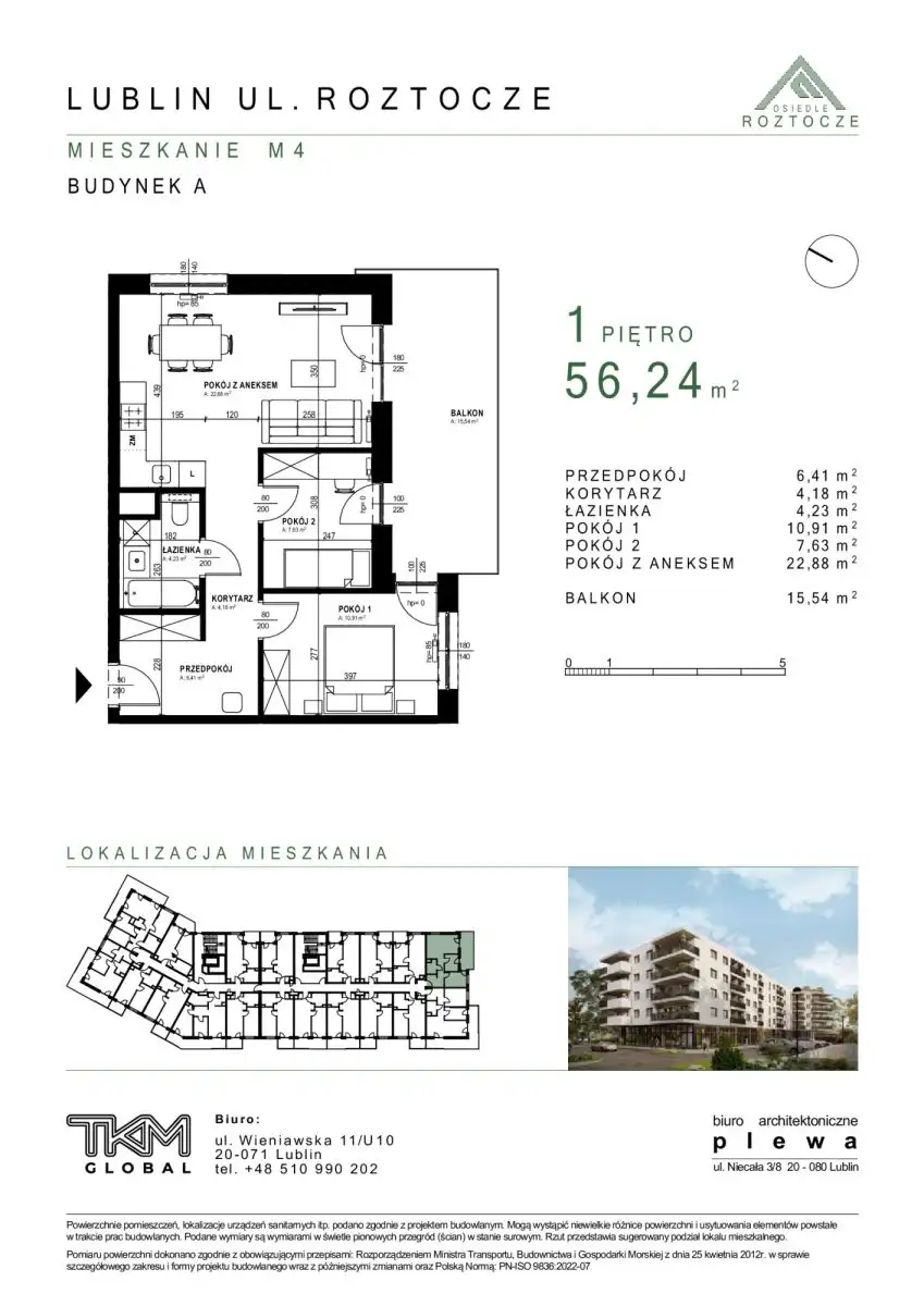 Przedstawiam Państwu 3-pokojowe mieszkanie zlokalizowane przy ulicy Roztocze na Węglinie Południowym. Nieruchomość o powierzchni 56,24 m² usytuowana jest na pierwszym piętrze w czteropiętrowym bloku. Na powierzchnię lokalu składa się salon z aneksem kuchennym (22,88 m²) z wyjściem na balkon (15,54 m²), pokój 1 (10,91 m²), pokój 2 (7,63 m²), łazienka (4,23 m²), korytarz (4,18 m²) oraz przedpokój (6,41 m²).
