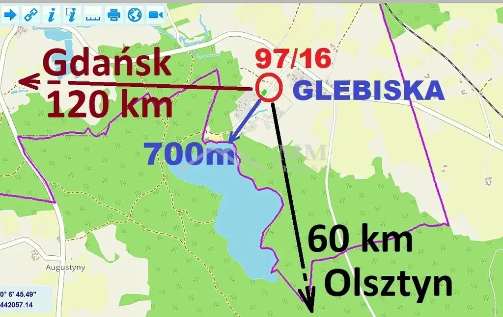Na sprzedaż działka rekreacyjna o powierzchni 1085 m², położona w malowniczej miejscowości Glebiska, gminie Pieniężno, powiecie braniewskim, jedynie 12 km od Ornety. Numer ewidencyjny działki: 97/16.