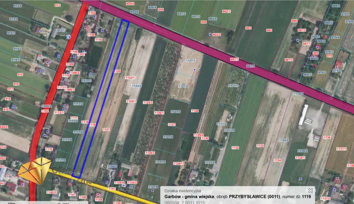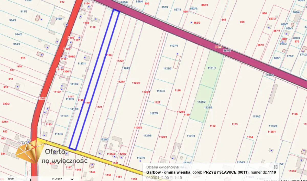 Nieruchomość gruntowa znajduje się w Przybysławicach w gminie Garbów przy trasie Lublin- Warszawa, działka nr 1119.