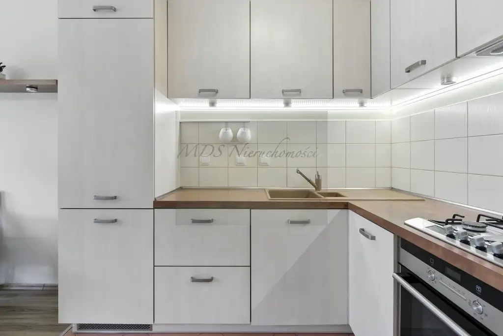 Mieszkanie zostało wykończone z dbałością o najmniejsze szczegóły. Funkcjonalna kuchnia wyposażona jest w kompletny sprzęt AGD: piekarnik, lodówkę, zmywarkę oraz elegancki zlewozmywak granitowy. Przestronna łazienka (6,2 m²) z pralką i suszarką sufitową oraz zabudową meblową zapewnia maksymalną wygodę codziennego użytkowania oraz miejsce do przechowywania.