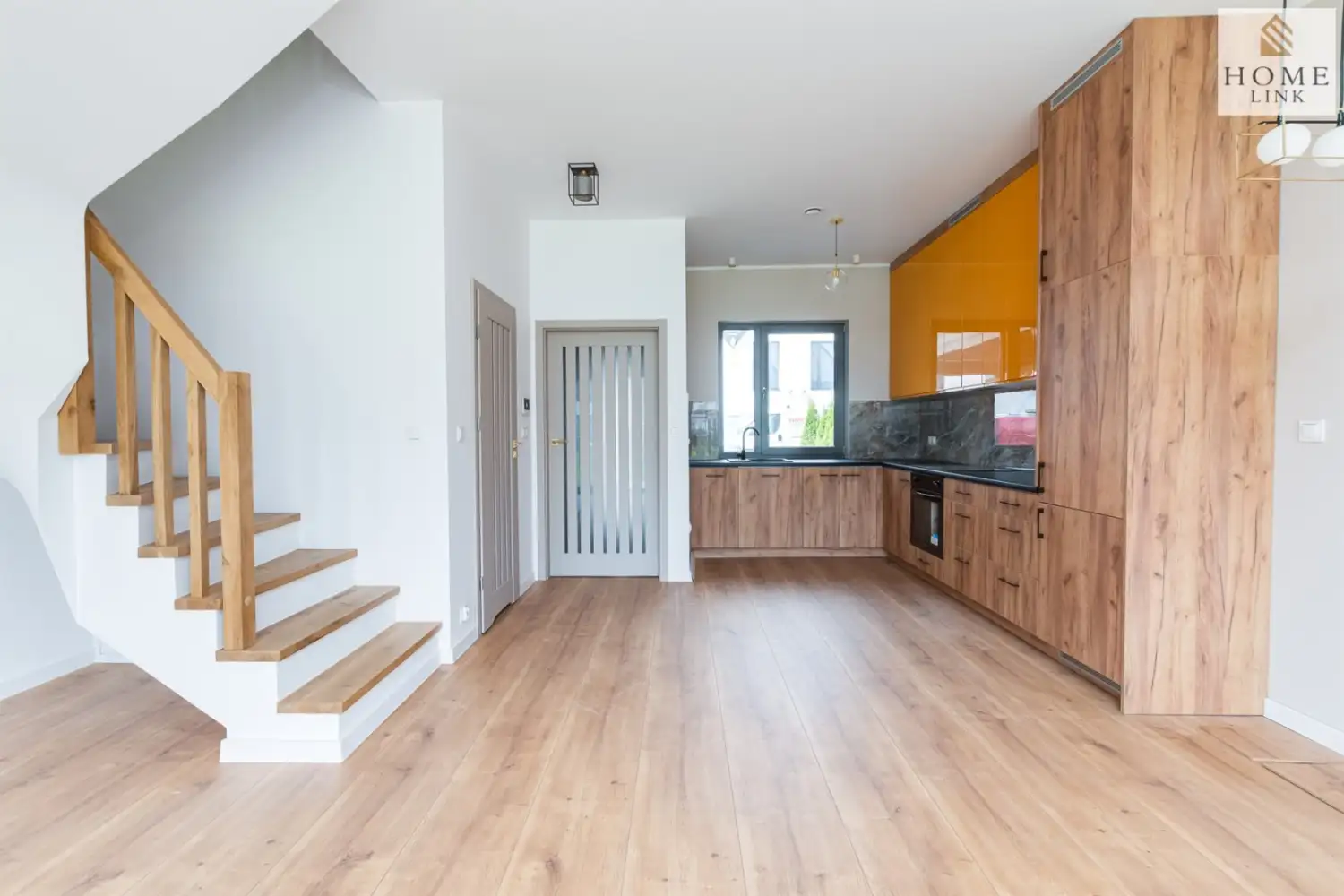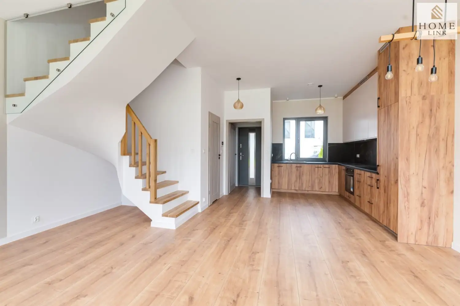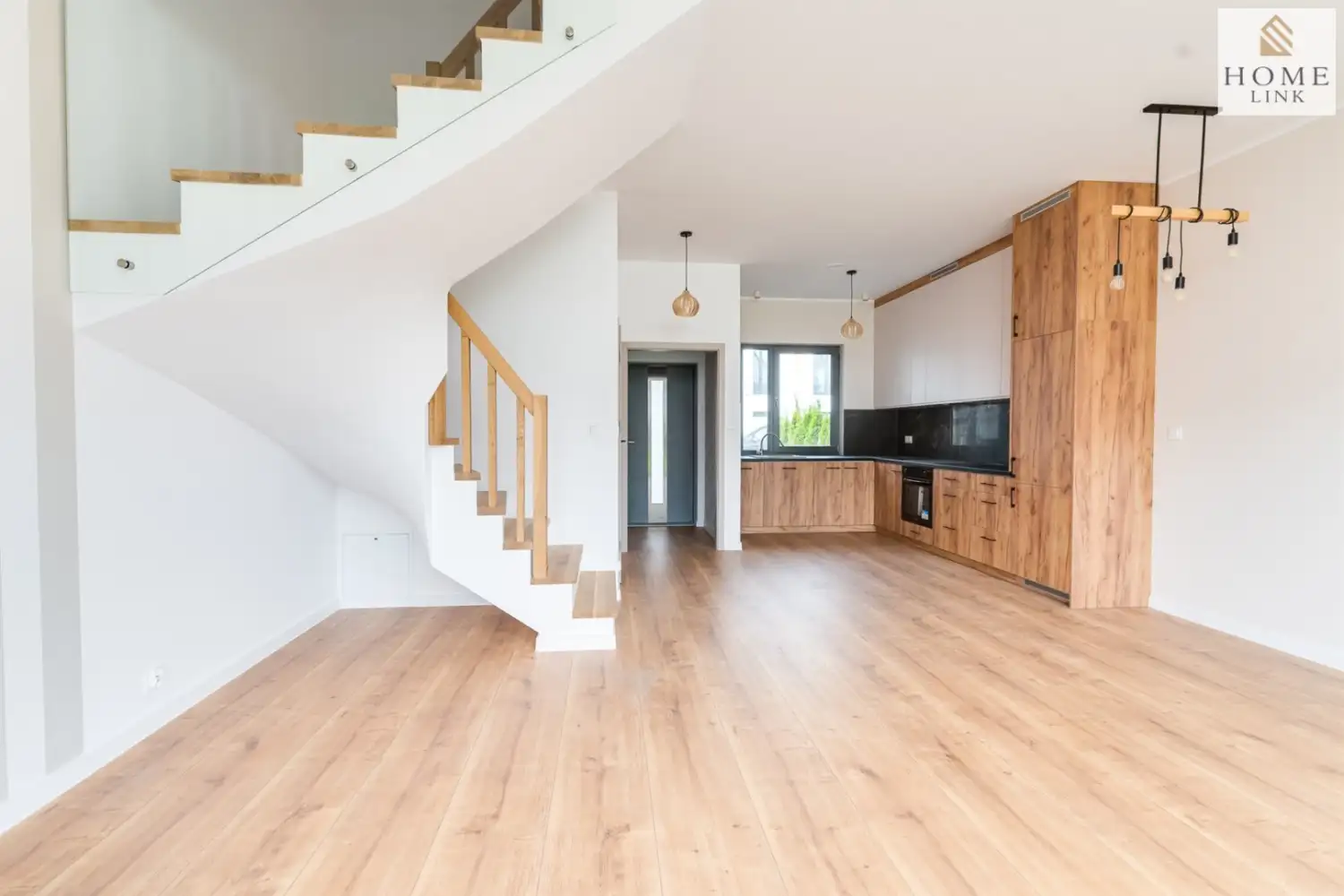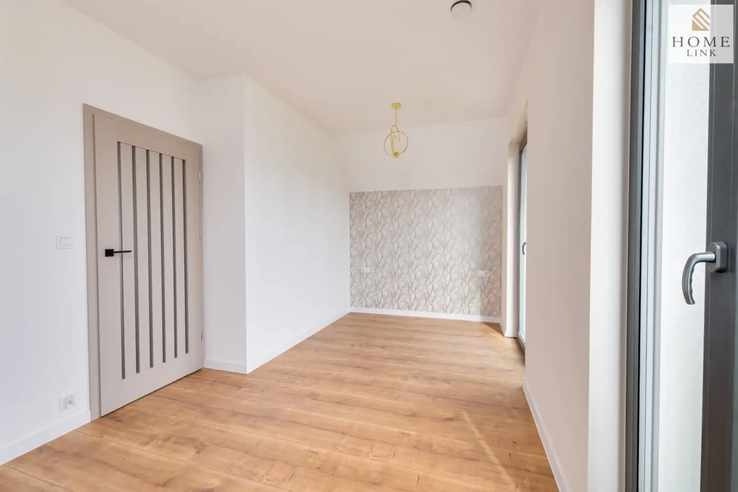 Dom został wybudowany w 2024 roku z betonu komórkowego, ściany zewnętrzne ocieplone dodatkowo styropianem. Dach pokryty jest blachodachówką w kolorze szarym oraz został docieplony wełną mineralną. Elewacja w kolorze białym wraz z szarymi dodatkami. Wnętrze domu to bardzo wysoki standard wykończenia, pomieszczenia wysokie są na odpowiednio: na parterze 2.7m², na piętrze 2.6m², zaimplementowana 3-szybową stolarkę okienną, drzwi antywłamaniowe, ogrzewanie podłogowe w każdym z pomieszczeń, wideo-domofon. Ogrzewanie domu realizowane jest za pomocą ekologicznej pompy ciepła marki Bosch (typu monoblok). Budynek został wyposażony również w system rekuperacji, który został zamontowany na strychu. Dom wykończony został pod klucz, co oznacza, że wszystkie pomieszczenia są przygotowane do użytkowania natychmiast, Wysoki standard wykończenia charakteryzuje się kompletnym wykończeniem kuchni w nowoczesne fronty lakierowane wraz ze sprzętem AGD (lodówka, zmywarka i okap w zabudowie), wykończoną łazienka wraz z niezbędną zabudową czy przygotowanymi pokojami do zamieszkania. W domu znajduje się wideomofon, kompletne oświetlenie i przykładowe meble wolnostojące wraz z dekoracjami (które stanowić mogą oddzielny przedmiot rozmów).