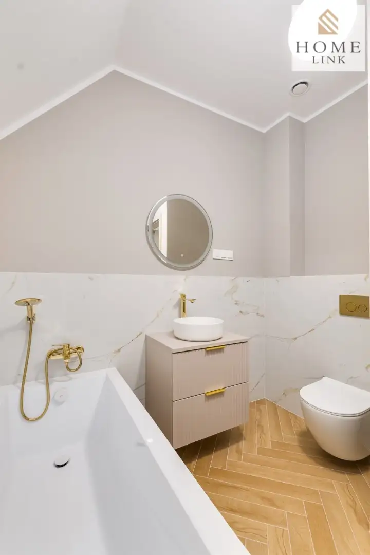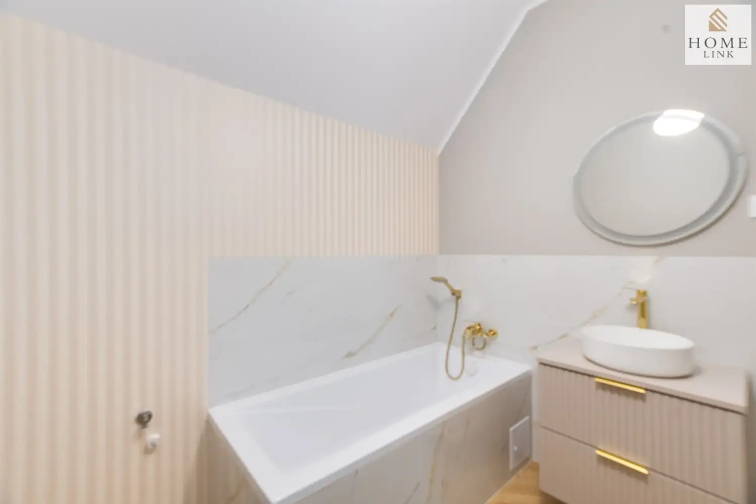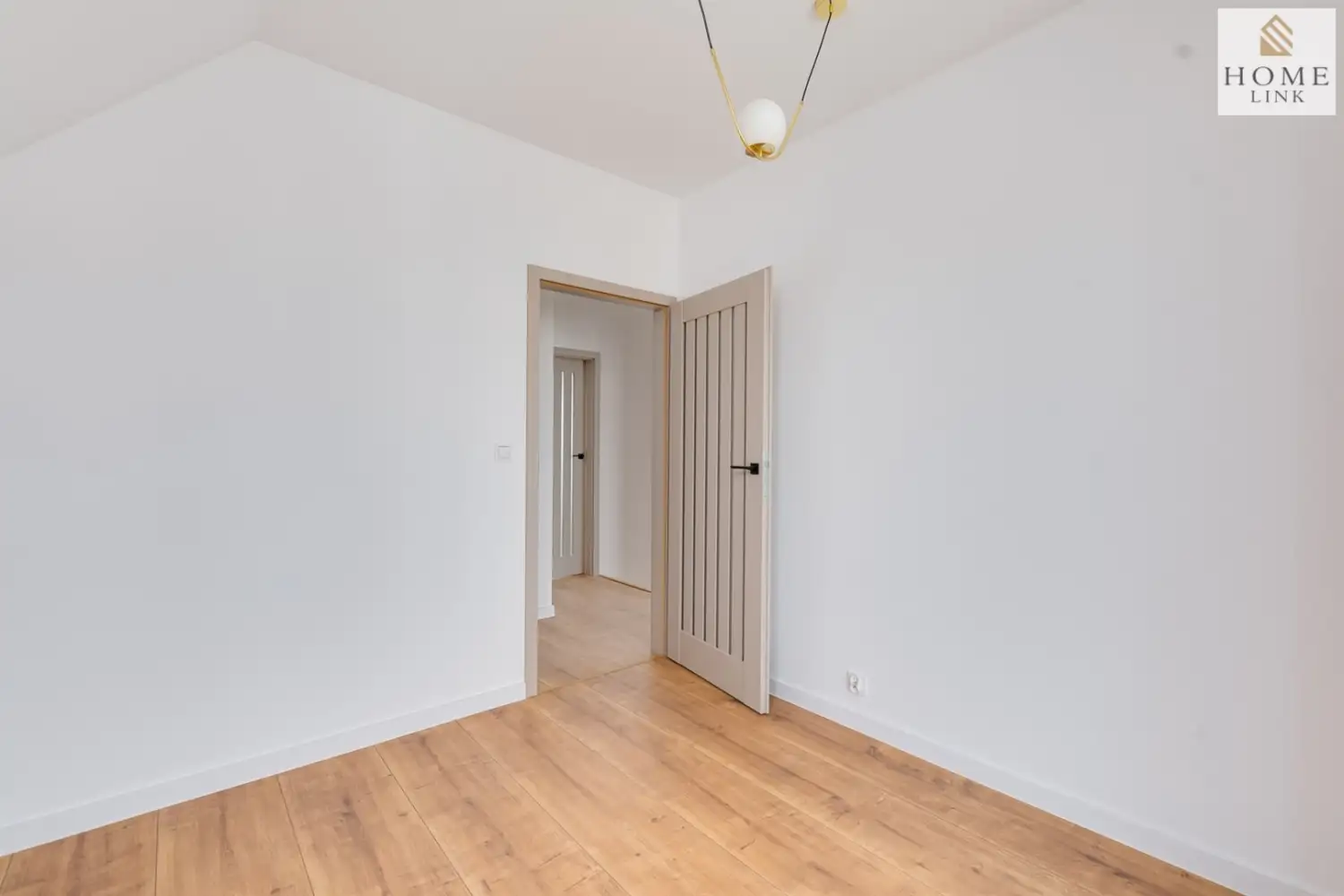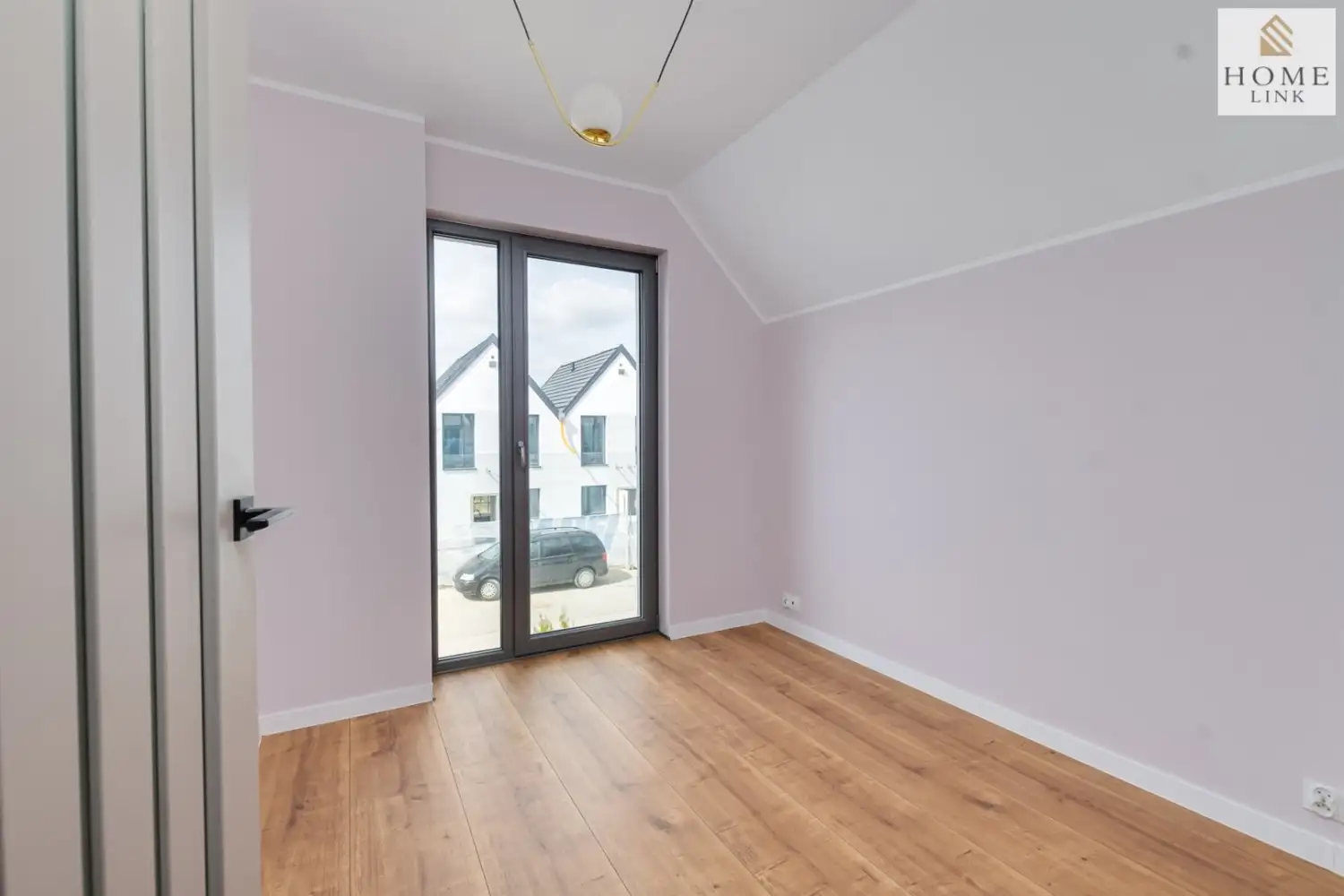 Dom został wybudowany w 2024 roku z betonu komórkowego, ściany zewnętrzne ocieplone dodatkowo styropianem. Dach pokryty jest blachodachówką w kolorze szarym oraz został docieplony wełną mineralną. Elewacja w kolorze białym wraz z szarymi dodatkami. Wnętrze domu to bardzo wysoki standard wykończenia, pomieszczenia wysokie są na odpowiednio: na parterze 2.7m², na piętrze 2.6m², zaimplementowana 3-szybową stolarkę okienną, drzwi antywłamaniowe, ogrzewanie podłogowe w każdym z pomieszczeń, wideo-domofon. Ogrzewanie domu realizowane jest za pomocą ekologicznej pompy ciepła marki Bosch (typu monoblok). Budynek został wyposażony również w system rekuperacji, który został zamontowany na strychu. Dom wykończony został pod klucz, co oznacza, że wszystkie pomieszczenia są przygotowane do użytkowania natychmiast, Wysoki standard wykończenia charakteryzuje się kompletnym wykończeniem kuchni w nowoczesne fronty lakierowane wraz ze sprzętem AGD (lodówka, zmywarka i okap w zabudowie), wykończoną łazienka wraz z niezbędną zabudową czy przygotowanymi pokojami do zamieszkania. W domu znajduje się wideomofon, kompletne oświetlenie i przykładowe meble wolnostojące wraz z dekoracjami (które stanowić mogą oddzielny przedmiot rozmów).
