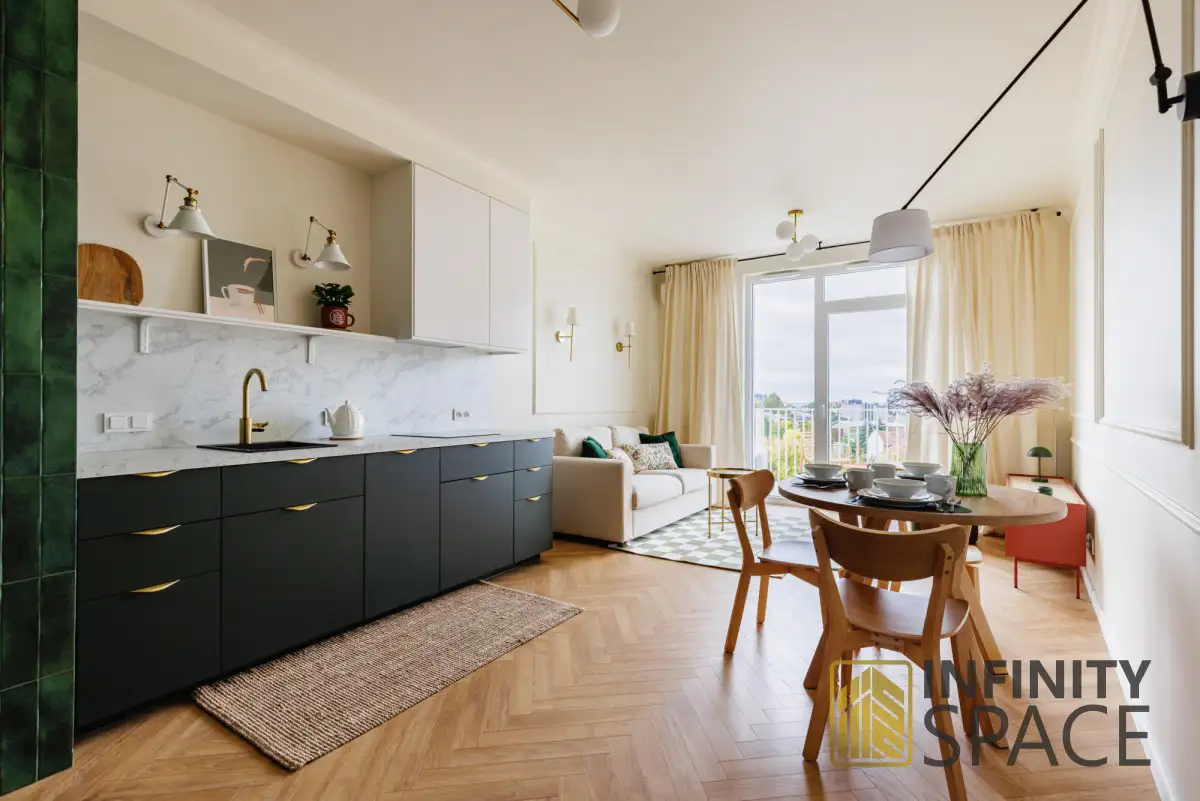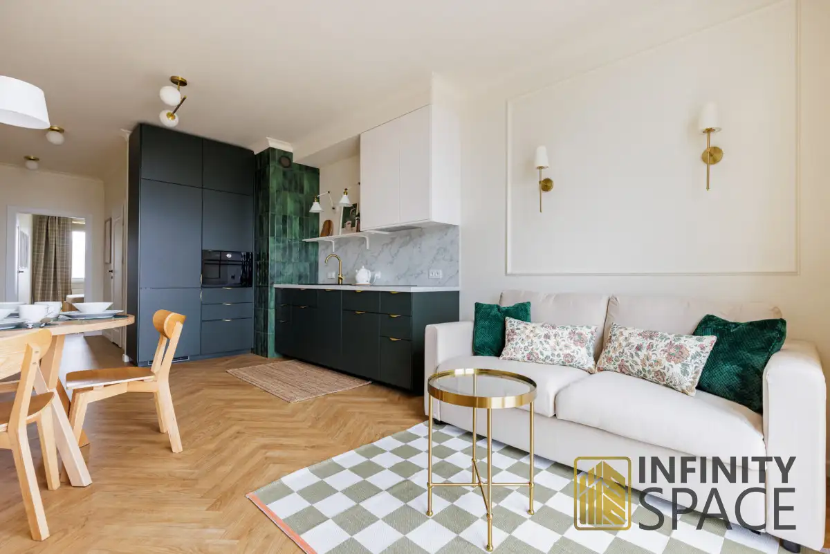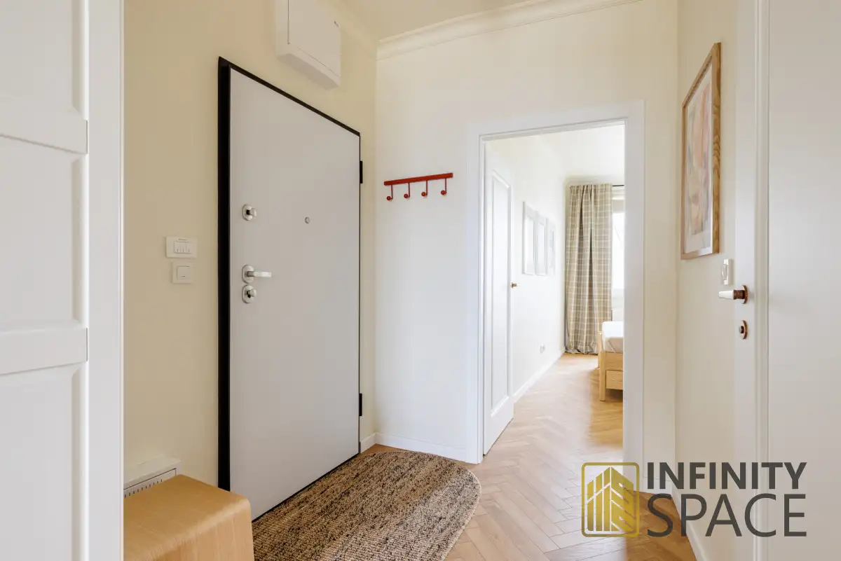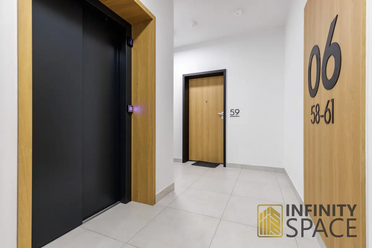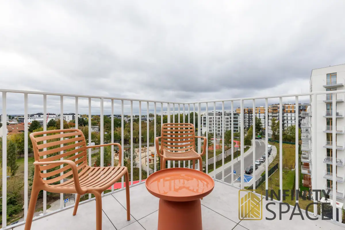 Flat:The two-room flat has an area of approximately 47 m² and is located on the 6th floor of the building (the top floor). The flat faces south-west, which guarantees no noise from busy streets and no neighbours outside the window. The high floor guarantees good lighting and a pleasant view from the balcony, where you can relax on sunny days. Air conditioning ensures thermal comfort in the flat. The flat is fully finished and equipped with all necessary appliances (dishwasher, oven, induction hob, extractor hood, fridge-freezer, washing machine).
