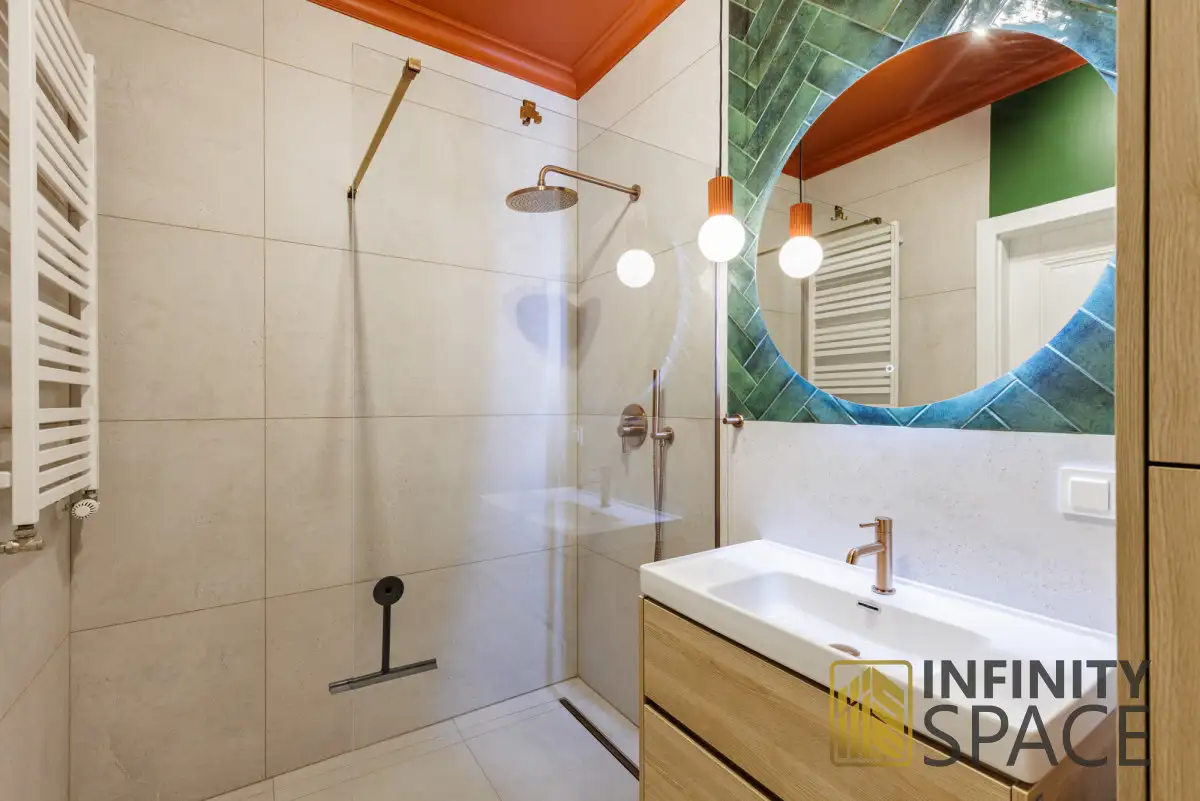 - łazienka - wyposażona w prysznic, pralkę oraz przestrzeń do przechowywania,