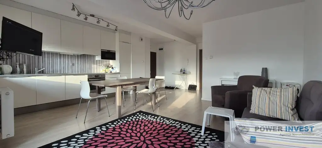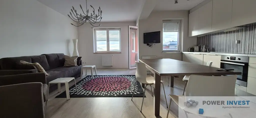 Niewątpliwym atutem prezentowanego mieszkania jest spory otwarty salon z aneksem z którego jest wyjście na balkon.